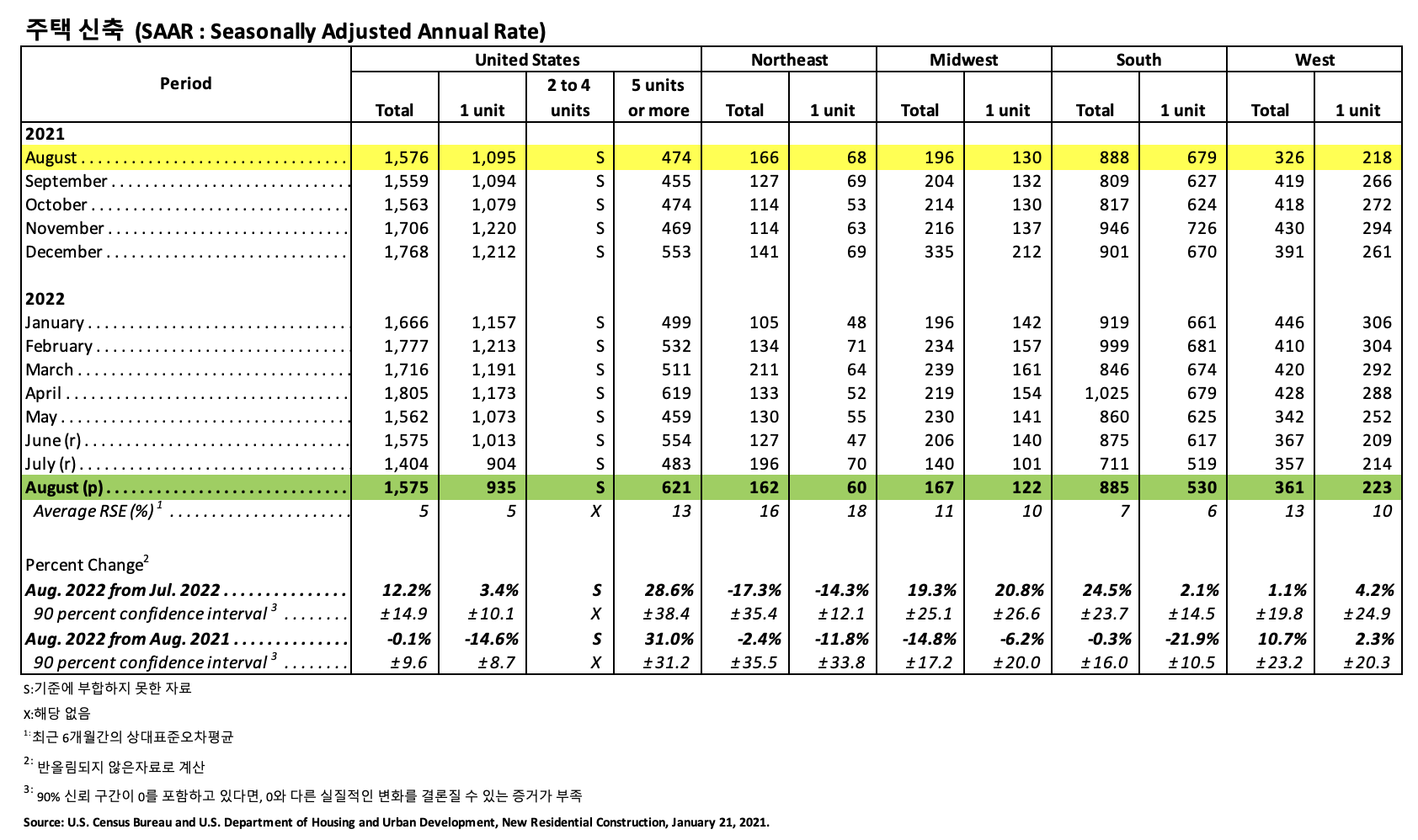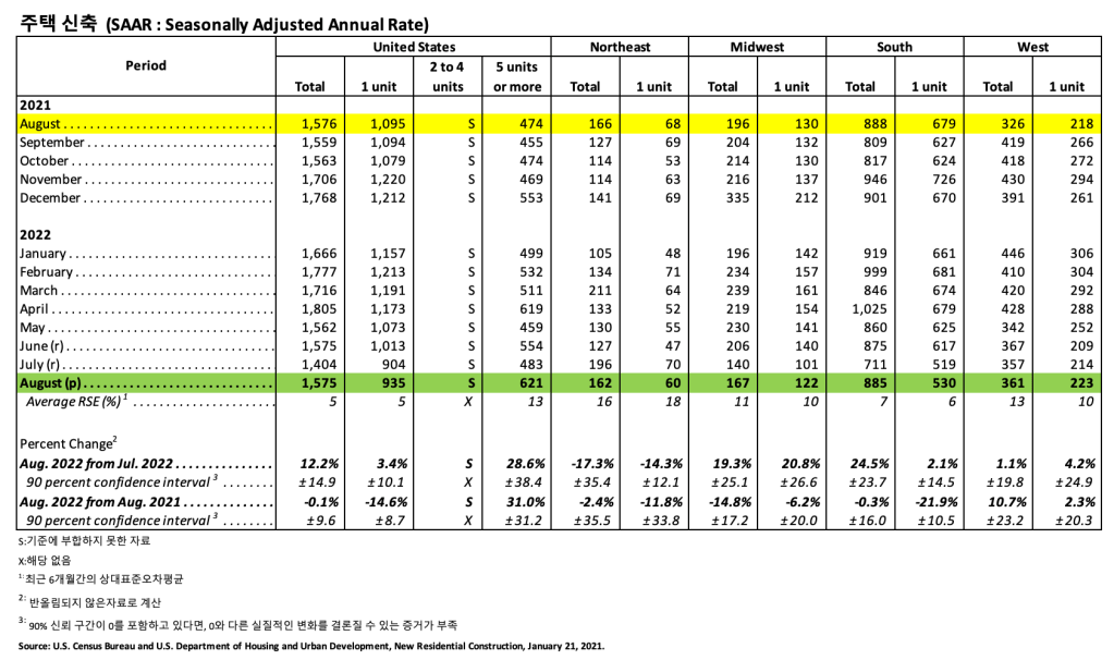 2022년 8월 사유 주택 신축은 1,575,000 (SAAR)으로, 2022년 7월 (1,404,000) 보다 12.2% (±14.9%) 상승하였고, 2021년 8월 (1,576,000) 보다는 0.1% (±9.6%) 낮았습니다. 8월의 단독 주택 신축은 935,000 (SAAR)으로 7월 (904,000)과 비교하여 3.4% (±10.1%) 상승하였습니다. 5가구 이상의 다중 주택 8월 신축은 621,000 (SAAR) 이었습니다.