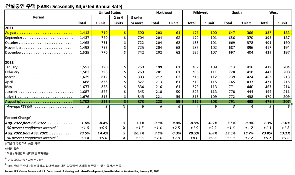 미국 인구 통계국 (U.S. Census Bureau)과 미국 주택과 도시 개발부 (U.S. Department of Housing and Urban Development)는 2022년 8월 미국 거주용 주택 건설 통계 자료를 합동으로 발표하였습니다.
