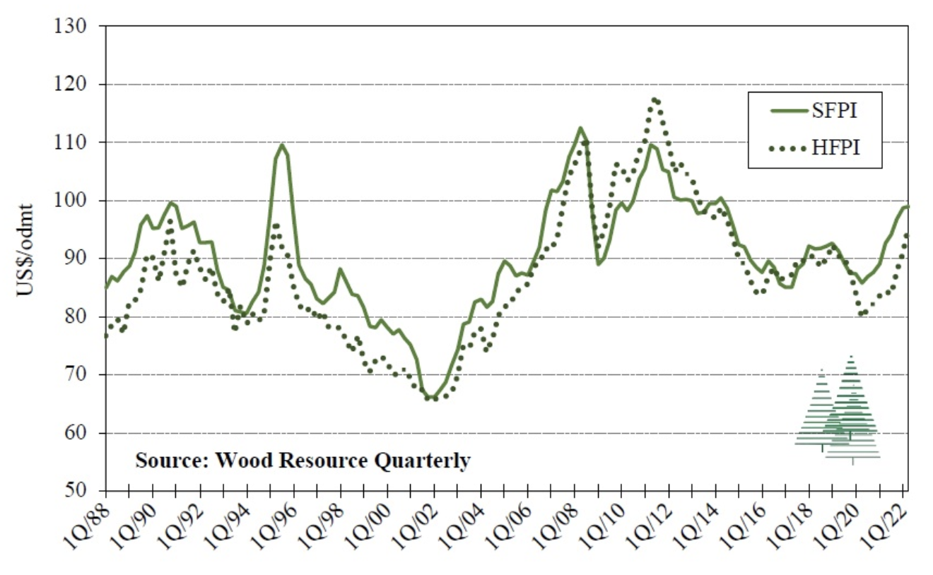 2022년 2사분기 잔세계 Wood fiber 가격은 상승하면서 2년 연속 상승세를 계속 유지하였고, 2사분기의 특징은 활엽수의 증가가 침엽수보다 빨랐습니다. 이런 경향이 반영되면서 Wood Resources International의2가지 전세계wood fiber 가격 지수 (US dollars 기준)는 US dollar 가 다른 국가들의 화폐에 비하여 강세를 보여 주고 있음에도 불구하고 2014년 이후 최고 수준을 기록하였습니다. 전세계Hardwood Fiber Price Index (HFPI)는 2022년 2사분기에 분기 대비 5.3%, 전년 대비 13% 이상 상승하였습니다. 하지만 전세계 Softwood Fiber Price Index (SFPI)는 2021년 2사분기이후 단지 7% 상승하여 $99.01/odmt 이었습니다. 시장 pulp 가격 기록적 상승, 낮은pulp 재고 수준, 제한된 wood fiber 공급으로 인하여 pulp용 원목과wood chips 의 가격은 지난 몇년동안 자국 화폐와 US dollars 기준으로 모두 상승하였습니다. 자국 화폐 기준으로 지난 12개월 동안 대부분의 유럽에서 가격은 10-55%, 라틴 아메리카에서 25-45% 상승하였고, 북미와 오세아니아에서의 가격은 좀 더 온건하게 상승하였습니다.