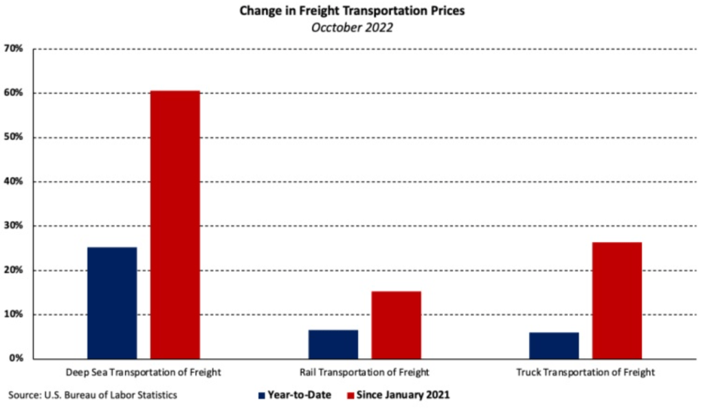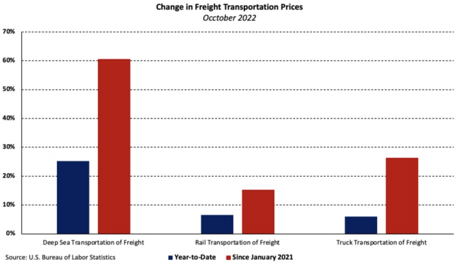 트럭, 철도, 해양 운송비 가격은 10월에 각각 하락하였습니다. 화물의 트럭 운송 가격은 10월에 1.4% 하락하여, 5개월 연속 하락이었습니다. 철도와 해양 운송비는 각각 0.7%, 1.8% 하락하였습니다. 올해 초부터 현재까지 해양, 철도, 트럭 운송비는 각각 25.2%, 6.5%, 6.0% 상승하였습니다.