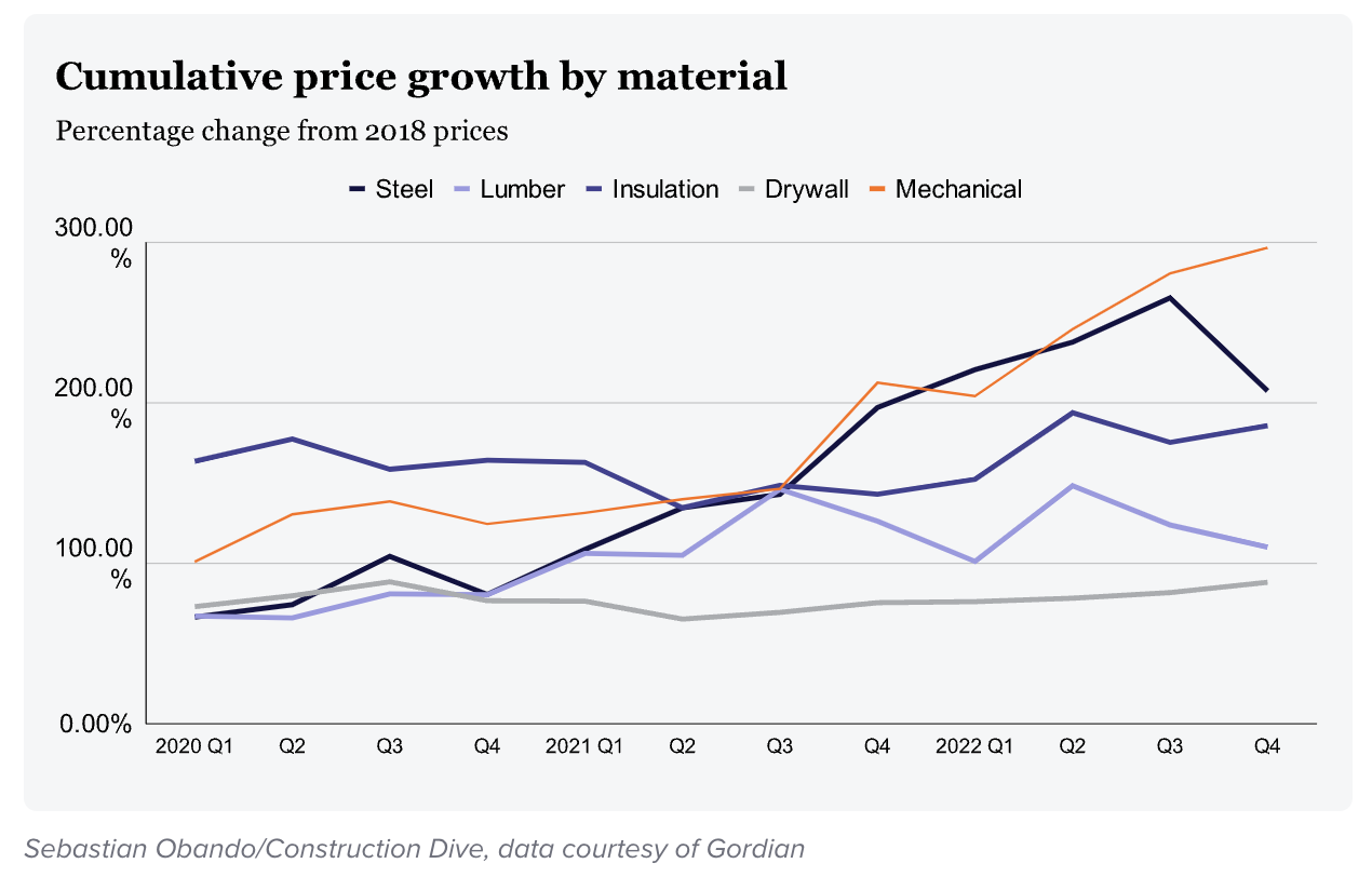 시멘트와 콘크리트 가격이 상승하였지만 철강과 같은 다른 구조재들은 다른 가격 여정을 보여주고 있습니다. 작년에 일부 극도의 가격 상승을 보여주었는데, 예를 들어 구리 가격은 44% 상승하였습니다. 철과 강철 가격은 약간 하락하여 5% 낮아졌지만 여전히 팬더믹 이전 수준보다는 높은 상황 입니다. 강철 가격은 최고점에서 3사분기에 현격하게 하락하여, 전국적인 가격은 대략 12% 하락하였습니다. 수요 약화가 철강 가격 하락을 좀 더 유도하였습니다. 강철 가격 하락과 유사하게 제재목 가격도 과잉 공급과 주택 시장 부진으로 인하여 현재 COVID 이전 수준으로 하락하였습니다. 제재목, 표준 #2 pine 보드, 합판, 구조재 가격 상승이 팬더믹 중에 급상 하였습니다. 하지만 2022년에는 보합세로 가격이 출발하더니, 최근에는 분기당 평균 9% 하락하였습니다. 금융 긴축 재정속에 전세계 불황이 예측되고 부가적으로 중국의 부동산 분야가 부진해지면서 전세계 수요가 약화 되었습니다. 하지만 중 & 장기적으로 초당적인 기반 시설법 (CHIPS Act & the Inflation Reduction Act)으로 인하여 미국내의 사회 간접 시설에 대한 지출이 고조되면서 수요가 유지될 것 입니다.