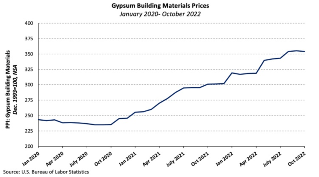 2022년 3사분기동안, 석고판 가격은 7분기 연속으로 상승하였습니다. 2020년 3사분기에 최고 수준을 기록하였고, 2022년 3사분기에는 최고 수준에서 추가적으로 8% 상승하였습니다. 수요와 자재 비용 상승으로 석고판 가격이 상승하였습니다. 생산 비용은 계속해서 상승하고 있지만, 수요의 상승 압력은 진정되고 있습니다. 단열재와 마찬가지로 석고판 공급은 최근에 안정되기 시작하였습니다.