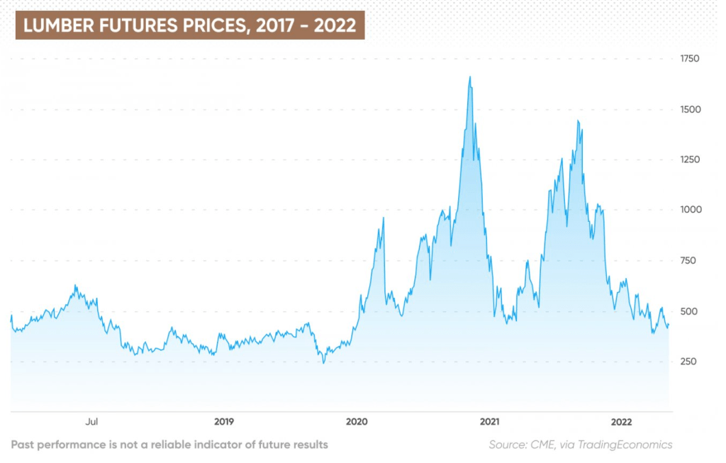 2022년 초반에 post-Covid 경제 회복과 부동산 수요는 제재목 선물 가격을 상승시켜, 2022년 3월에는 6개월 최고 가격인 $1,464.40/bft이었습니다. 불황에 대한 공포가 성장하고, 미국과 다른 경제 개발국이 인플레이션과 싸우기 위하여 이자율을 상승시키면서 1사분기 말부터 제재목 선물 가격은 하락하기 시작하였습니다.