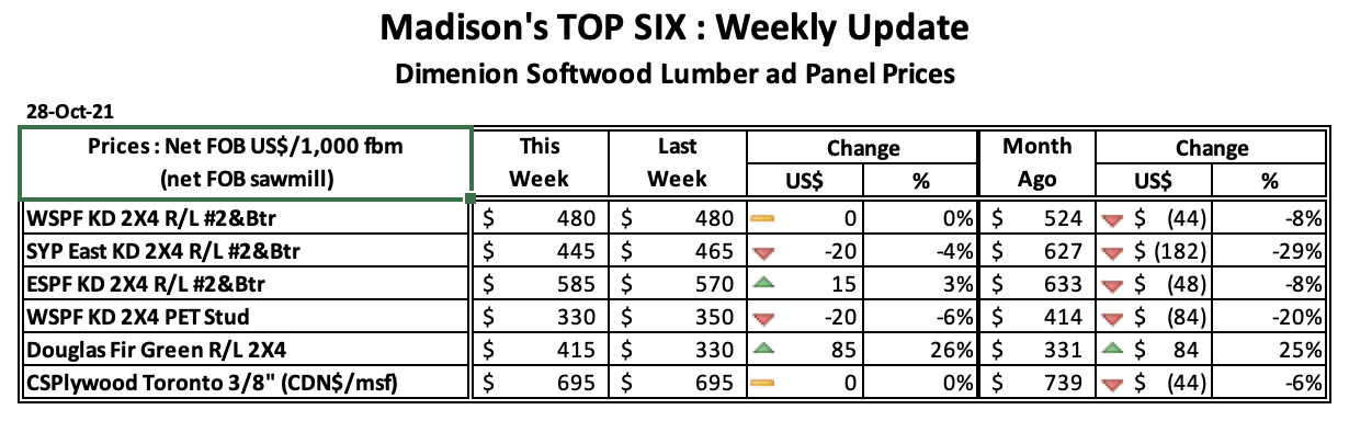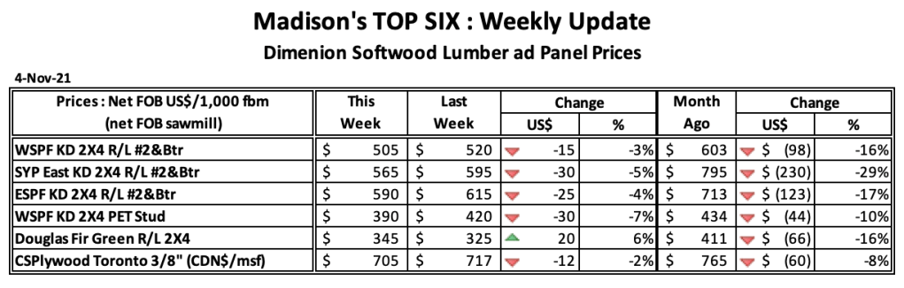 시장의 일반적인 분위기가 11월 이 되면서 배타적이 되면서 Western S-P-F 제재목 공급 업체들은 덜 바쁜 시기를 보냈습니다. 겨울의 다가오는 불안이 큰 요인이고, 기후 변화에 대응하기 위하여 위기를 대비해여 한다는 것이 대화의 중심이 되었습니다. 제재소 오퍼 판매 리스트는 빈약하였고, 점점 더 빈약해지고 있습니다.
