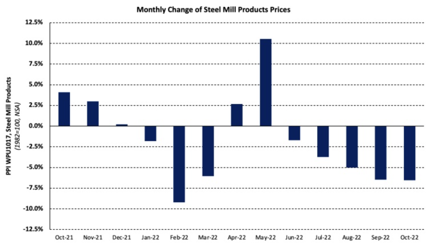 2022년 10월 철강 공장 생산품 가격은 6.6% 하락하였고, 2022년 5월이후 21.6% 하락하였습니다. 가격 지수는 5개월 연속으로 하락하면서 2021년 5월이후 사장 낮은 수준 입니다.