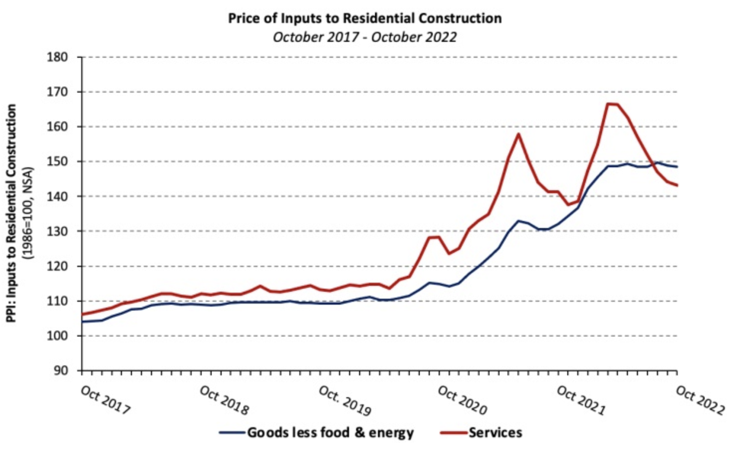 가장 최근의 생산자 가격 지수(Producer Price Index : PPI) 보고서에 따르면 2022년 10월 미국의 건축 자재 가격은 0.2% 하락하였고, 9월에는 0.5% 하락하였습니다. 지수는 2015년이후 처음으로 5개월동안 4개월이 하락하였습니다. 에너지를 포함한 거주 건물 건설에 투입되는 제품들의 PPI는 디젤 연료가 9.5% 그리고 무연 가솔린이 5.7% 상승하면서 0.2% 높아졌다고 National Association of Home Builders (NAHB)는 발표하였습니다.