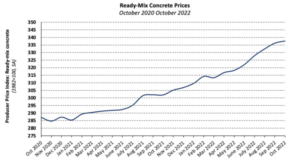 생산 비용 상승으로 인하여 시멘트와 콘크리트 가격은 최근에 계속해서 상승하여 2022년 3사분기에는 전년 대비 약 14% 올랐습니다. 생산과 운송 비용이 현격히 진정되지 않으면서 시멘트와 콘크리트 가격은 현재 최고에 근접하였다고 보고되었습니다. 새로운 공급망 문제가 계속해서 터져 나오는데, 예를 들어 미시시피 강의 바지선은 가뭄으로 수위가 낮아지면서 운영이 중단되어서 시멘트와 다른 무거운 건축 자재 운송에 제한이 발생하였습니다. 시카고와 밀워키 부근의 계약업체들에 따르면 시멘트 운송은 2021년 수준의 60%로 낮아졌습니다. 텍사스의 경우 2021년 3월 겨울 폭풍 우리 때문에 일부 시멘트 제조업체들이 폐쇄되었고, 결과적으로 시멘트 부족이 발생하였습니다. 수요가 공급을 압도하면서 시멘트 가격은 상승하였고, 다른 제조업체들은 공급을 증가시키기 위하여 안간힘을 썼습니다. 대략 43주가 시멘트의 공급 부족을 보고하였습니다. 그러는 동안 필수적인 콘크리트 가격도 전세계적인 공급 부족으로 거의 2배 이상 상승하여 현재 $10/ton 입니다.