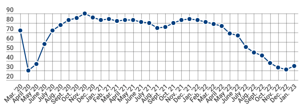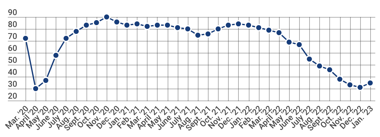 지난 35년 이상 시행된 NAHB의 월간 설문조사에서 도출된 자료를 통하여 NAHB/Wells Fargo HMI (주택 시장 지수)는 현재 단독주택 판매와 향후 6개월동안의 판매 예상에 대한 건설업자의 인식을 “good,” “fair” 혹은 “poor”로 측정합니다. 설문조사는 건설업장에게 잠재 고객들의 혼잡율을 “high to very high,” “average” 혹은 “low to very low”로 질문하고 있습니다. 각각에 대한 지수는 계정적으로 조정되는 지수 계산에 사용됩니다. 50이상이 의미하는 것은 더 많은 건설업자들이 상황이 나쁜 것도보다는 좋은 것으로 판단하는 것 입니다. 2021년 12월 이후 HMI 3가지 지수 모두 상승한 것은 처음입니다. 현재 판매 조건을 측정한 HMI의 1월 지수는 4 포인트 상승하여 40이었고, 향후 6개월 동안의 판매 예상에 대한 HMI 지수도 2 포인트 상승하여 37 이었습니다. 잠재적 고객의 혼잡을 측정한 지수도 3 포인트 상승하여 23 이었습니다. 지역 HMI 지수에 대한 3개월 동안의 이동 평균을 살펴보면, 서부는 1 포인트 상승하여 27, 남부는 36으로 변화가 없었고, 동북부는 4 포인트 하락하여 33, 중서부도 2 포인트 하락하여 32 이었습니다.
