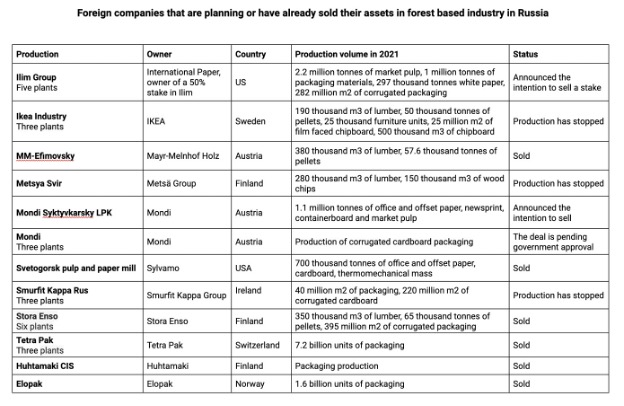 지난해 pulp와 종이 산업에서, 서구 대형 포장 제조업체가 러시아 시장을 떠났습니다. Tetra Pak은 총생산량이 7 billion units 포장재인 러시아내의 3 공장들을 제재로 인한 생산 부품의 공급 불가능을 이유로 지역 관리로 인양하였습니다. Stora Enso는 395 million m3의 골판지 포장재를 생산하는 4개의 공장을 3개의 공장을 운영하는 Novopak에 판매하였습니다. 노르웨이의 Elopak은 연간 1.6 billion units 포장재를 생산하는 러시아내의 공장을 지역 관리로 판매하였습니다. Amcor도 러시아내의 3새 공장을 판매한다고 발표하였습니다. 핀란드의 Huftamaki는 러시아 사업을 Espetina에 Euro 151 million에 판매하였습니다. 아일랜드의 Smurfit Kappa Group은 러시아에서의 철수와 220 million m2의 골판지와 40 million m2의 포장재 생산 능력의 3개 공장의 운영을 중단한다고 발표하였습니다. Sylvamo는 700 thousand tonnes 생산 능력의 Svetogorsk pulp와 종이 공장을 Pulp Invest에 판매 하였습니다. 오스트리아의 Mondi는 러시아내의 포장 사업 (Mondi SLPK 제외)을 1.6 billion rubles에 Gotek Group에 판매하였습니다.