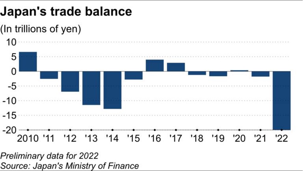높은 원자재 가격과 일본 엔화 약세로 수입 비용이 증가하면서 일본의 2022년 연간 무역 수지 적자는 19.97 trillion yen ($155 billion)라고 화요일에 보고되었습니다. 재무부에 발표한 예비 자료에 따르면, 일본의 수출은 지난해에 18% 성장하여 98.18 trillion yen이었고, 수입이 39% 상승하여 118.15 trillion yen이었습니다. 수출과 수입 모두 기록적으로 최고 수준이었습니다. 하지만 연간 적자가 2년 연속 계속되었고, 2014년에 기록한 최고 적자 수준인 12.8 trillion yen을 훨씬 넘었습니다. 자원 부족 국인 일본은 연료 수입에 심하게 의존하고 있습니다. 러시아의 우크라이나 침공이후에 에너지 가격이 전세계적으로 상승하면서 수입 원유 가격은 2022년에 91.5% 상승하였고, 액화 천연 가스 가격도 97.5% 상승하였습니다. 전세계 이자율이 상승하고, 식료품, 원자재, 다른 상품의 수입 비용이 상승하는 동안 일본 중앙 은행은 극도로 느슨한 재정 정책을 유지하면서, 부가적으로 일본 엔화 약세는 지난해 10월에 미국 달러에 대하여 32 최저 수준이었습니다. 통계에 따르면 2022년 일본 엔환율은 전년 109.41보다 하락하여 평균적으로 130.77/$이었습니다.