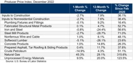 2022년 12월에 인플레이션이 완화되면서 건축 자재 가격은 하락하였습니다. 미국 노동청(U.S. Bureau of Labor Statistics)이 발표한 생산자 가격지수 (Producer Price Index) 자료를 분석한 Associated Builders and Contractors에 따르면 12월에 건축투입가격은 11월과 비교하여 2.7% 하락하였습니다. 비거주용 건축투입가격도 11월에 0.8% 하락한 이후에 12월에도 2.7% 하락하였습니다. 하지만 전체적인 건축투입가격은 전년대비 7.9% 높았고, 비거주용 건축투입가격도 7.6% 높았습니다. 원유 (Crude petroleum) 가격은 12월에 급격하게 14.9% 하락하였고, 침엽수 제재목 가격도 5.1% 하락하였습니다. 하지만 등록된 모든 분야가 하락한 것은 아닙니다. 12월에 천연가스는 45.3% 상승하여 2020년 2월이후 315.6%로 엄청나게 상승하였습니다. 조립 가공된 구조용 금속 제품 (fabricated structural metal products), 콘크리트 제품, 아스팔트, 타르 지붕 재, 사이딩 제품의 가격은 약간 올랐습니다.