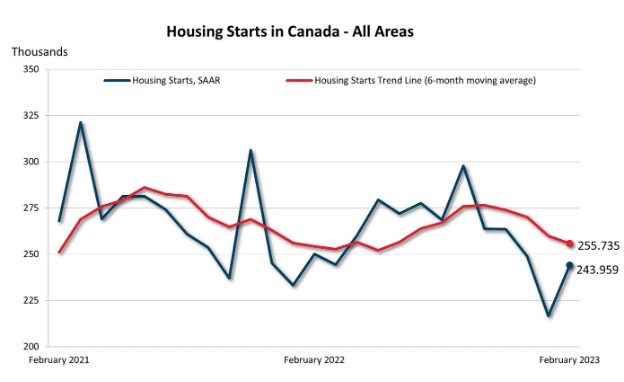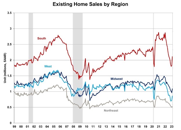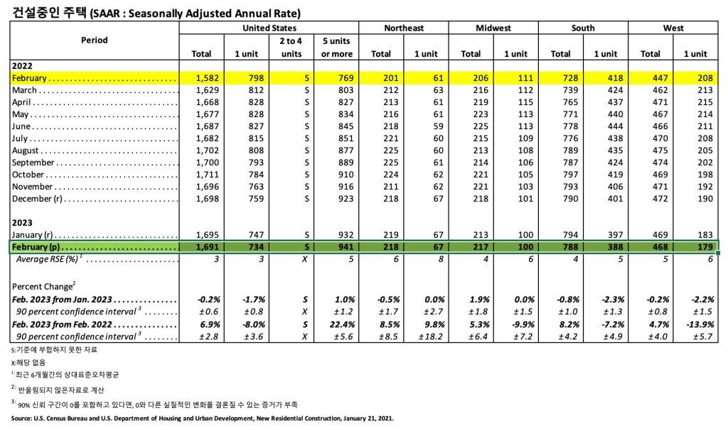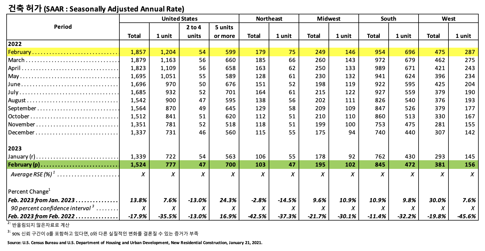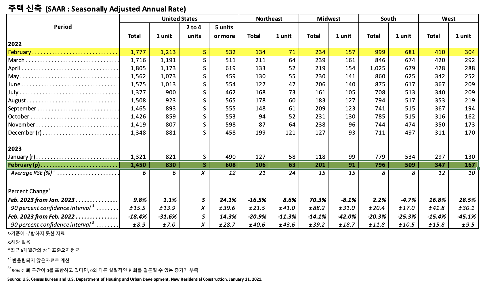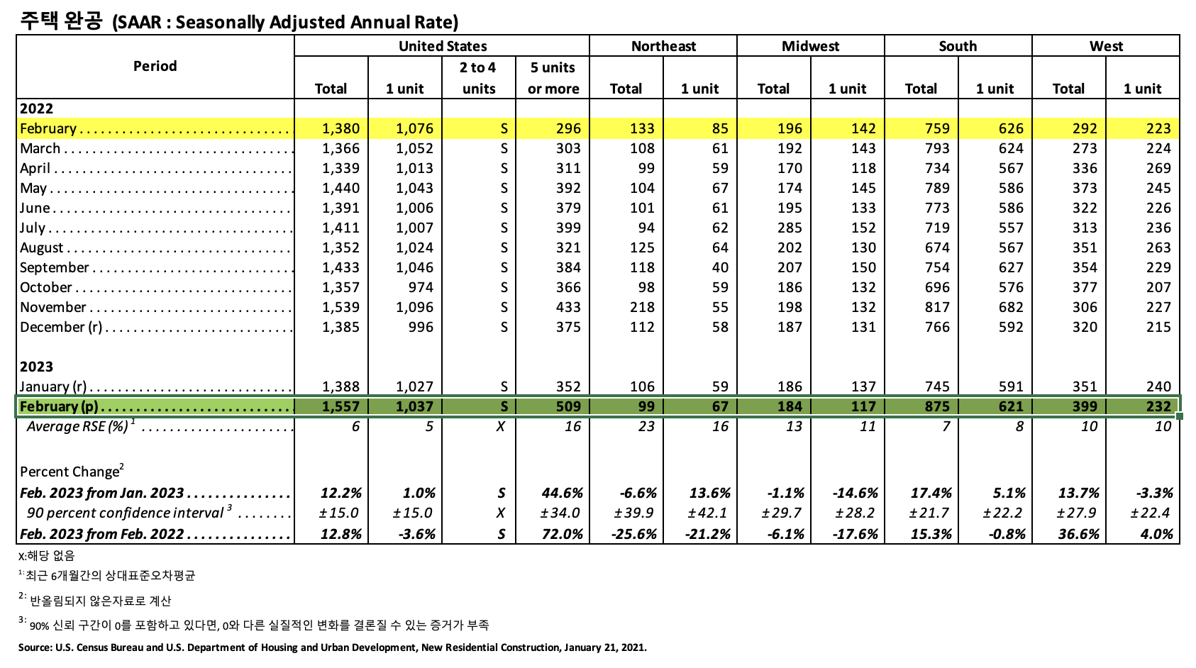 시장에서 주택이 머무는 시간, 즉 판매까지의 시간은 2월에 평균적으로 34일인데, 참고적으로 1월에는 33일, 2022년 2월에는 18일 이었습니다. 2월에 판매된 주택의 57%는 시장에 등록된 이후에 1개월 이하로 판매되었습니다. 2월에 전액 현금 판매 비율은 28%이었는데, 1월에는 29%, 작년 같은 시기에는 25% 이었습니다. 전액 현금 판매는 이자율 변화에 덜 영향을 받습니다. 2월의 기존 주택 판매 중간 값은 전년 대비 0.2% 하락하여 $363,000으로 131개월 연속 전년 대비 상승을 마감하였지만, 가장 장기 상승 기록을 경신하였습니다. 2월의 콘도미니엄과 협동 조합의 중간 값은 전년 대비 2.5% 상승하여 $321,000이었습니다. 지역적으로 2월에 기존 주택 판매는 모든 4개의 지역에서 상승하였습니다. 동북부는 4.0%, 서부는 19.4%, 중서부는 18.7%, 서부는 28.3% 상승하였습니다.