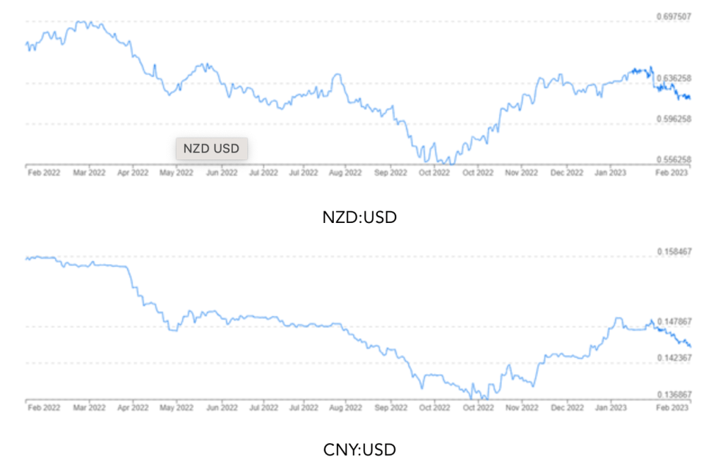 1월에 NZD는 USD 대비 1 cent 강세 이었지만, 2월에는 USD 대비 2 cents 약세 이었습니다. 지난 몇 주 동안 CNY는 USD 대비 안정적 이었지만, 1월말에는 반대로 USD 대비 약세 이었습니다.