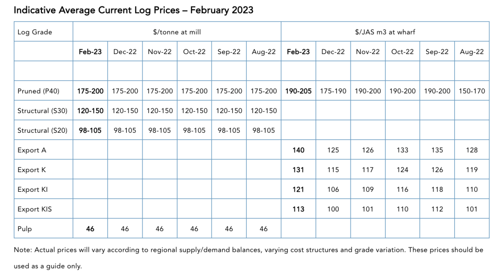 1사분기동안에 나라 전체적으로 원목 가격은 매우 작은 변화만 있습니다. 전지 원목(Pruned logs) 가격은 변화가 없이 유지되었지만, 일부 지역에서 구조용 원목(structural logs) 가격은 약 $1/tonne 하락하였습니다. 수많은 건축 합의가 되었지만, 프로젝트가 시작되지 못하고 있습니다. 이런 이유는 열악한 기상, 높은 이자율, 비지니스 불확실성 때문 입니다. 구조용 제재목의 과잉 공급이어서, 다수의 공장은 생산량을 적극적으로 감소시키고 있습니다. 판매자가 시장 점유율을 유지하거나 증가를 고려하면 가격 압력이 존재 합니다. 다수 공장의 관리자들은 자신들이 기억하는 한 지금이 가장 최악의 데킹 시즌이라고 언급하였습니다. 무절 목재가 프리미엄 데킹 제조에 사용됩니다. 무절 제재목의 유럽 수출 가격은 명확하게 여전히 강세입니다. 아시아 국가들로의 제재목 수출 가격은 계속적으로 하락하였습니다. 일부 등급은 지난 6개월 동안 40% 하락하였습니다.