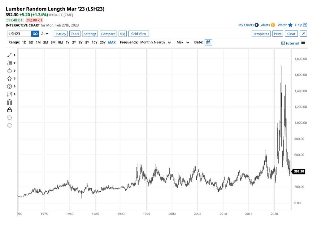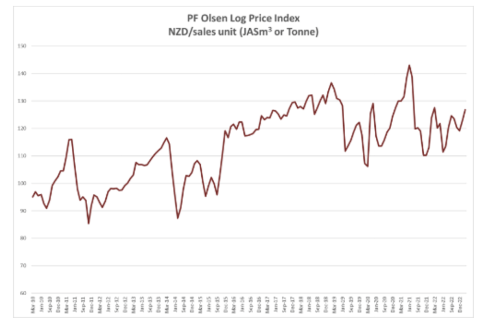 PF Olsen Log Price Index (원목가격지수)는 1월과 2월에 $4 상승하여 $127이었습니다. 지수는 현재 2년 평균보다 $4, 5년 평균보다 $3 높았습니다.