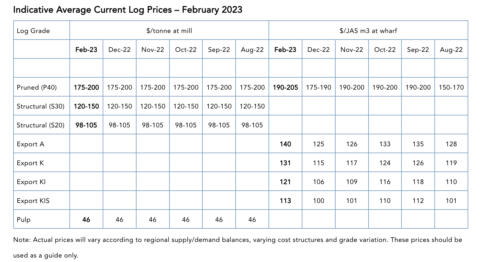 수출 원목의 부두 게이트(At Wharf Gate : AWG) 가격은 1월과 2월에 $7-$8/JASm3 상승하였습니다. 중국의 원목 수요는 음력 새해이후 예상된 것만큼은 증가하지 않았지만, 뉴질랜드 North Island의 북부 ½ 이상 지역이 심각한 기상 현상으로 인하여 뉴질랜드 원목 공급은 심각한 수준으로 감소할 것 입니다. 이로 인하여 중국의 원목에 대한 가격 상승 압력이 증가할 것으로 생각됩니다. 뉴질랜드는 건설 프로젝트가 연기되거나 취소되면서 자국 원목 수요는 약화되고 있습니다. PF Olsen Log Price Index는 1월과 2월에 $4 상승하여 $127이 되었습니다. 지수는 현재 2년전보다 $4, 5년전보다는 $3 높습니다.
