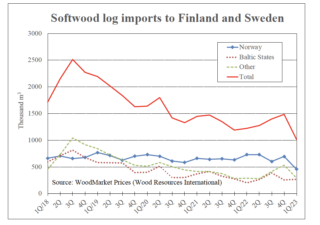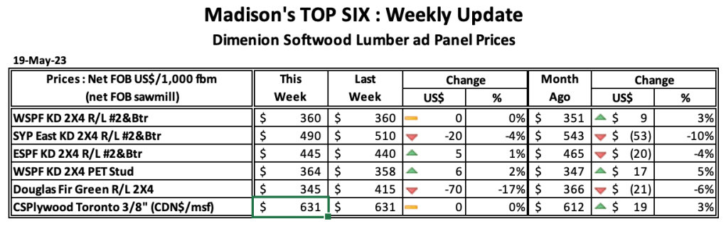 캐나다 Western Canadian S-P-F 제재목 교역자들의 이번주 대화의 중요 주제는 산불이 계속되었습니다. 산불로 인하여 수천명이 대피하였고, 계속되는 건조하고 더운 날씨 조건들이 캐나다 서부 특히 Alberta에 어려움을 더 하고 있습니다. 최근의 감산 발표로 공급 상태에 대한 또 다른 임박한 의문을 더하였습니다. 구매자들은 여전히 신중하고, 판매량은 여전히 활기가 없지만, 증가하는 미래 수요 징후가 명백하였습니다. 아직까지는 산림화재로 중요 고속도로를 폐쇄하지 않으면서, 운송을 순조로운 상황 이었습니다. 하지만 화재때문에 Alberta에서 느려진 운송이 다수 발생하였습니다. 2023년 5월 19일로 마감한 주의 침엽수 제재목 기준 가격인 Western Spruce-Pine-Fir 2×4 #2&Btr KD (RL)의 가격은 전주와 같은 US$360 mfbm이었습니다. 이는 전월 가격인 $351보다 $9, 2% 높았습니다. 1년전 같은 시기의 가격인 US$1,070 mfbm와 비교하면 $710, 66% 하락하였고, 2년전 가격인 $1,640보다 $1,280, 78% 낮았습니다.