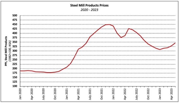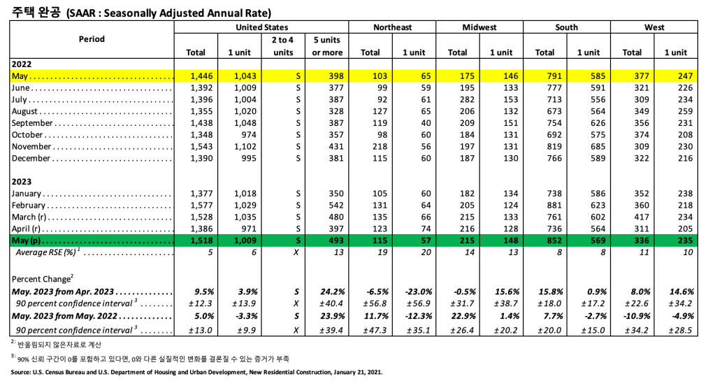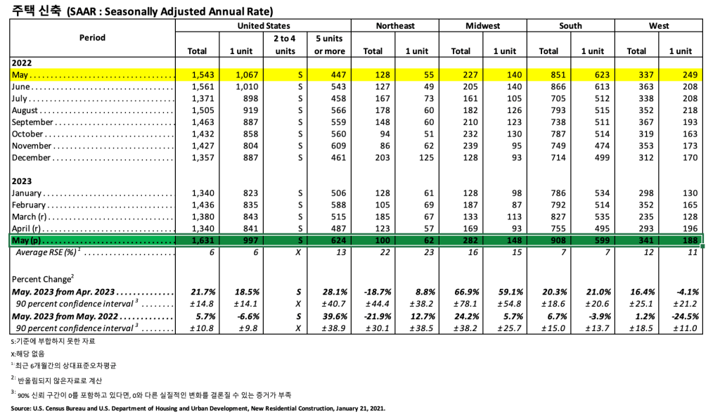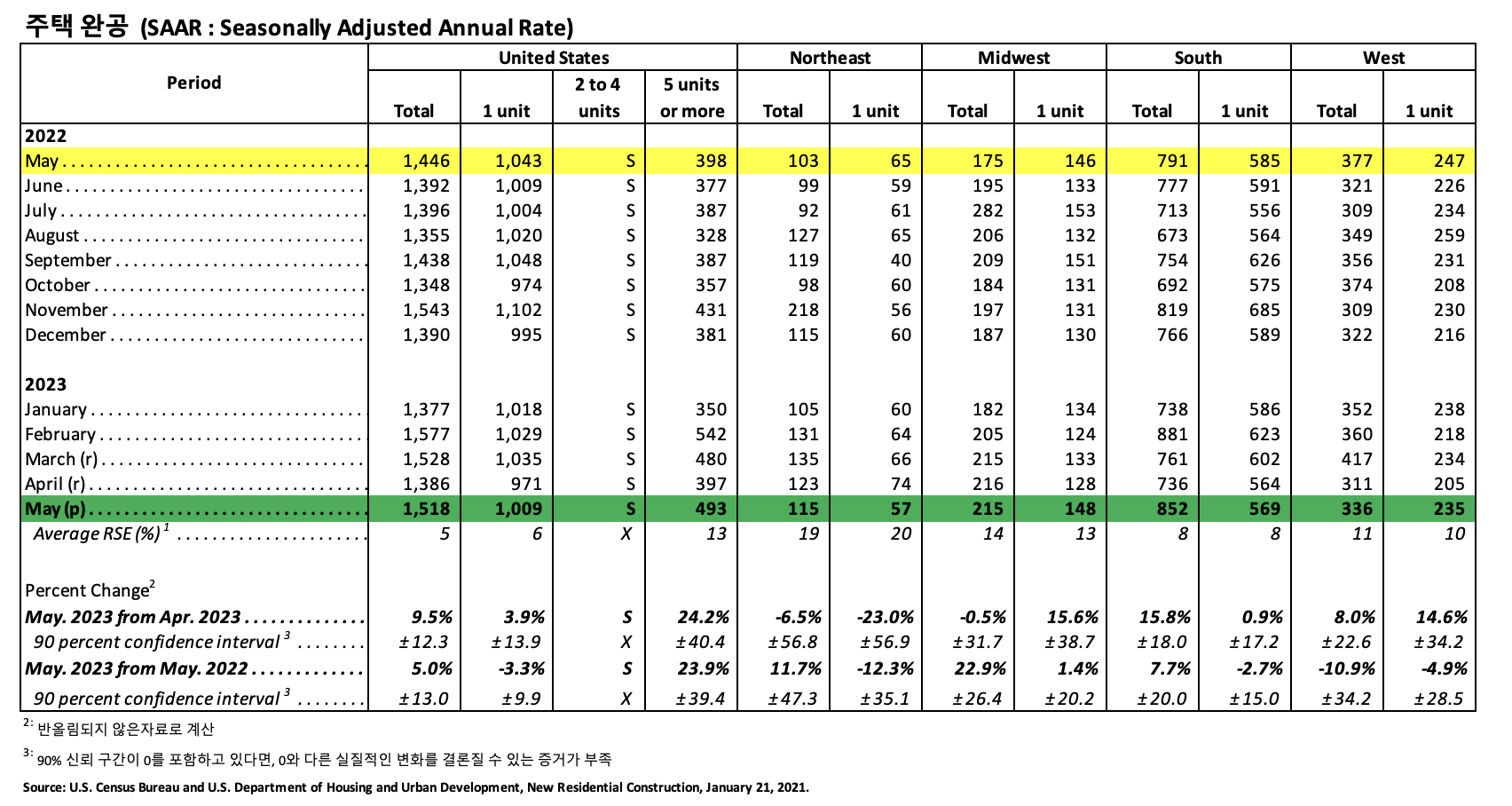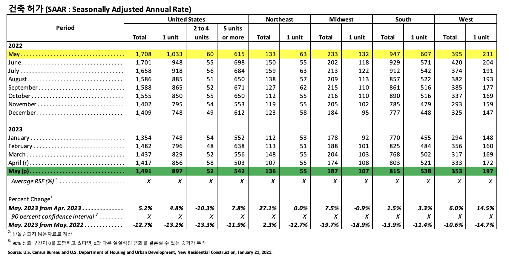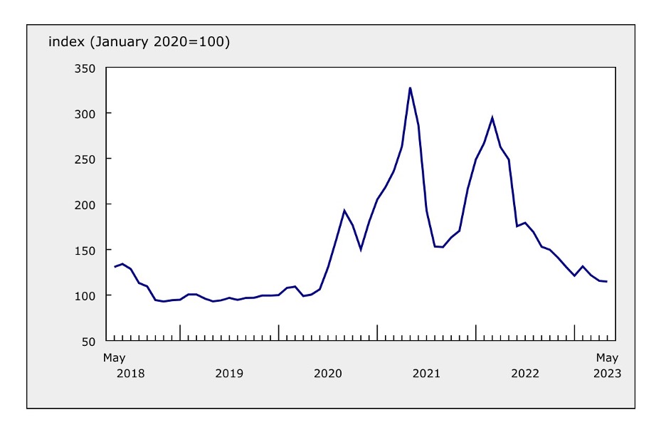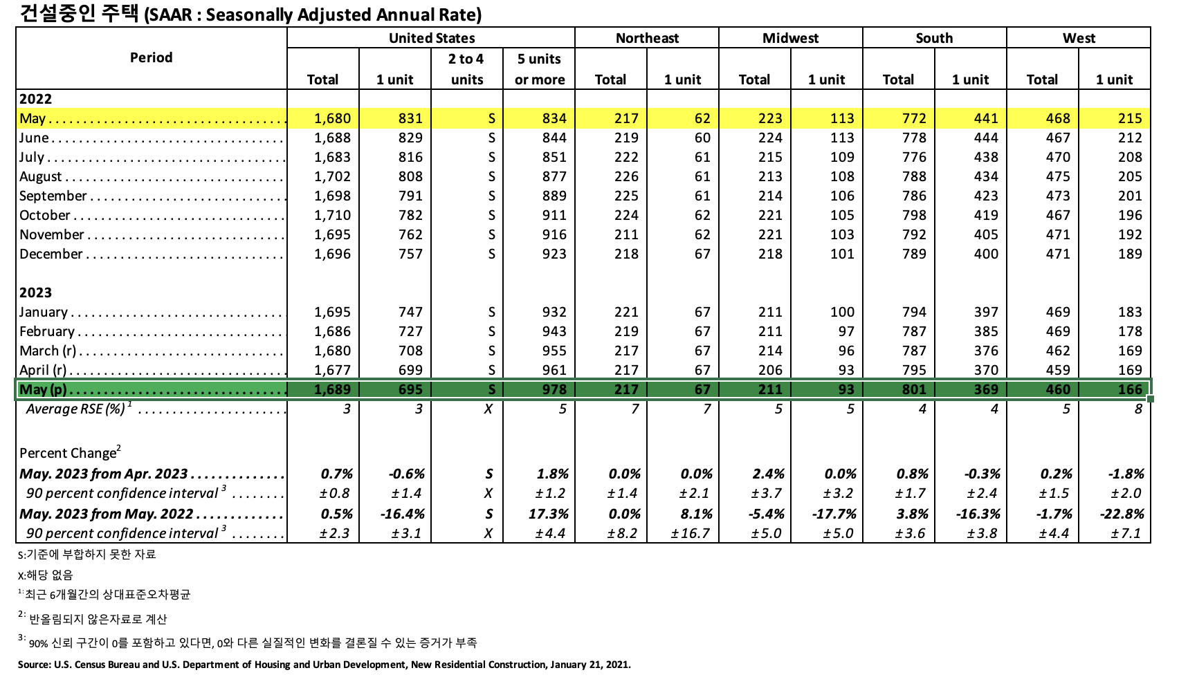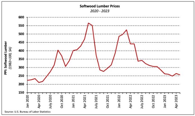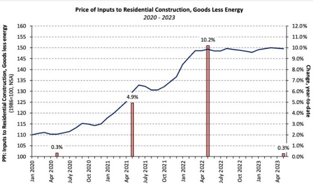 가장 최근의 생산자 가격 지수 (Producer Price Index) 보고서에 따르면, 에너지를 제외하고 주거용 건설에 투입되는 건축 자재 가격은 4월에 0.2% 하락이후에 2023년 5월 0.1% (계절적으로 조정되지 않은) 하락하였습니다. 지수는 올해 초부터 현재까지 0.3% 증가하였지만, 2021년과 2022년에 각각 보여준 전년 대비 10.2%, 4.9%에 비하여 현저한 대조를 보여주었습니다.
