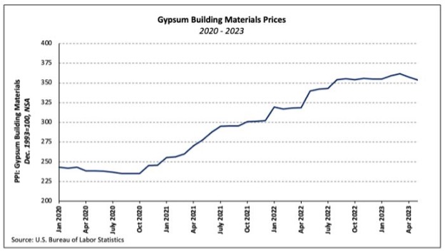 석고 건축자재(gypsum building materials) PPI는 2개월 연속으로 1.1% 하락하였고, 올해초부터 현재까지 0.4% 하락하였습니다. 석고 건축자재 가격은 1년전보다 4.0% 높지만, 2022년 7월이후 가장 낮은 수준이었습니다.