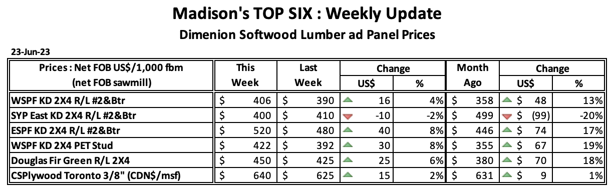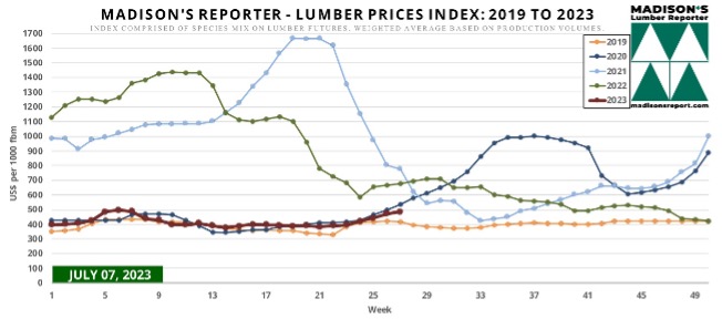 2021년과 2022년의 제재목 가격의 극심한 변동성은 백미러에 나타나고, 좀 더 안정적으로 되면서, 올해에는 정상 가격으로 갈 것이라고 Madison Lumber의 소유주 Keta Kosman은 예상하였습니다. 이번 주 Western spruce-pine-fir (SPF) 가격은 상승하여 US $446/thousand board feet이었다고 Kosman는 보고하였습니다. 이 가격은 B.C. 제재소들에게는 좋은 상황 입니다. 작년 이후 높아진 운영 비용과 가용가능한 목재 공급 감소에 상당한 부분 기인하면서 다수의 B.C. 제재소들은 잠정적인 감산 혹은 운영 중단을 하였습니다. 제재목 가격은 팬더믹중에 리모델링과 레노베이션의 증가로 상승하였고, 그로 인하여 새로운 주택의 시장도 상승하였습니다. B.C. 지역의 원목 공급의 감소와 운영 비용 상승으로 공급이 도전을 받았습니다. 2021년에는 Western spruce-pine-fir (SPF) 가격은 역사상 최고 수준으로 US $1,600/thousand board feet이었고, 2022년에는 제재목 가격이 U S$1,410/thousand board feet 이었습니다. B.C. 제재소들은 생산한 제재목을 매우 높은 가격을 받았지만, 많은 제재목을 실질적으로 생산하지 못하였다는 것을 Kosman는 주목 하였습니다. 그래서 Kosman에 따르면 제재목 판매량이 많지 않았고, $1,600의 4개 철도 차량보다는 $800의 40 철도 차량으로 판매 하였습니다. 지난 해에 제재목 가격은 조정되었는데, 매우 갑작스럽고, 급격하였다고 Kosman은 주장하였습니다. 인플레이션을 완화할 목적으로 이자율을 상승 시키면서 주택 가격은 실로 진정되었습니다. 하지만 밀레니엄 세대들의 영향으로 새로운 주택에 대한 근본적인 수요 암시인 주택 신축이 상승하였습니다. 2023년 5월 미국의 주택 신축에 대한 가장 최근 데이터에 따르면, 5월 신축은 4월과 비교하여 22%, 2022년 5월보다는 6% 상승하였습니다. 북미 특히 미국에는 수요 지지 기반이 존재 하였습니다. 왜냐하면 다수가 35세로 진입하는 밀레니엄세대를 포함한 처음으로 주택을 구입하는 구매자들의 단일 최대 집단 때문 입니다. 그래서 진짜 수요의 모멘텀이 존재한다고 Kosman은 언급하였습니다. 산불 혹은 B.C. 항구에서 현재 진행되는 파업과 같은 노동 쟁의와 같은 다른 외부 요인은 제재목 시장에 충격을 줄 것이고, 일반적으로 말하면 제재목 수요와 가격이 정상적으로 복귀할 것 같습니다. 새로운 정상 수준이 어디인지를 자세하 검토하고 있다고 Kosman는 말했습니다.