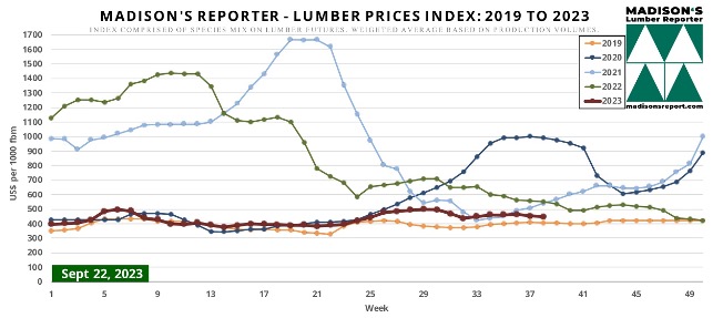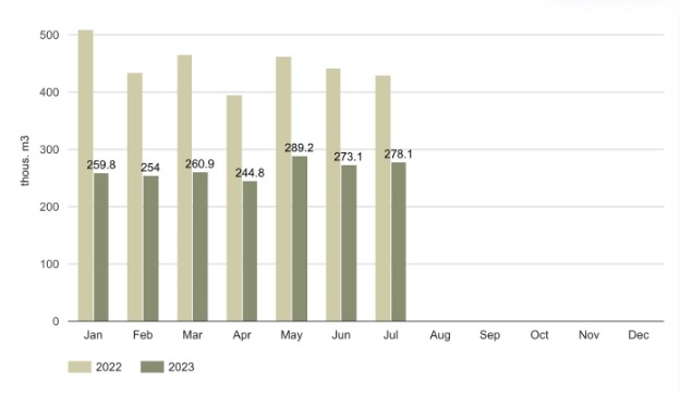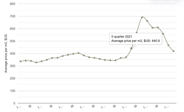2023년 상반기동안 일본의 제재목 수입량은 전년 대비 42% 감소하여 1,582 thousand m3이었고, 수입액도 59% 하락하여 $701 million이었습니다. 일본의 제재목 수입 평균 가격도 30% 하락하여 $443/m3이었습니다. 2023년 2사분기 일본의 제재목 수입 평균 가격은 $419/m3으로 2021년 1사분기이후 가장 낮았습니다.