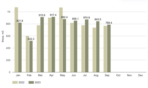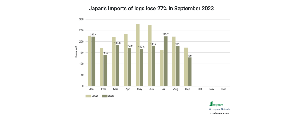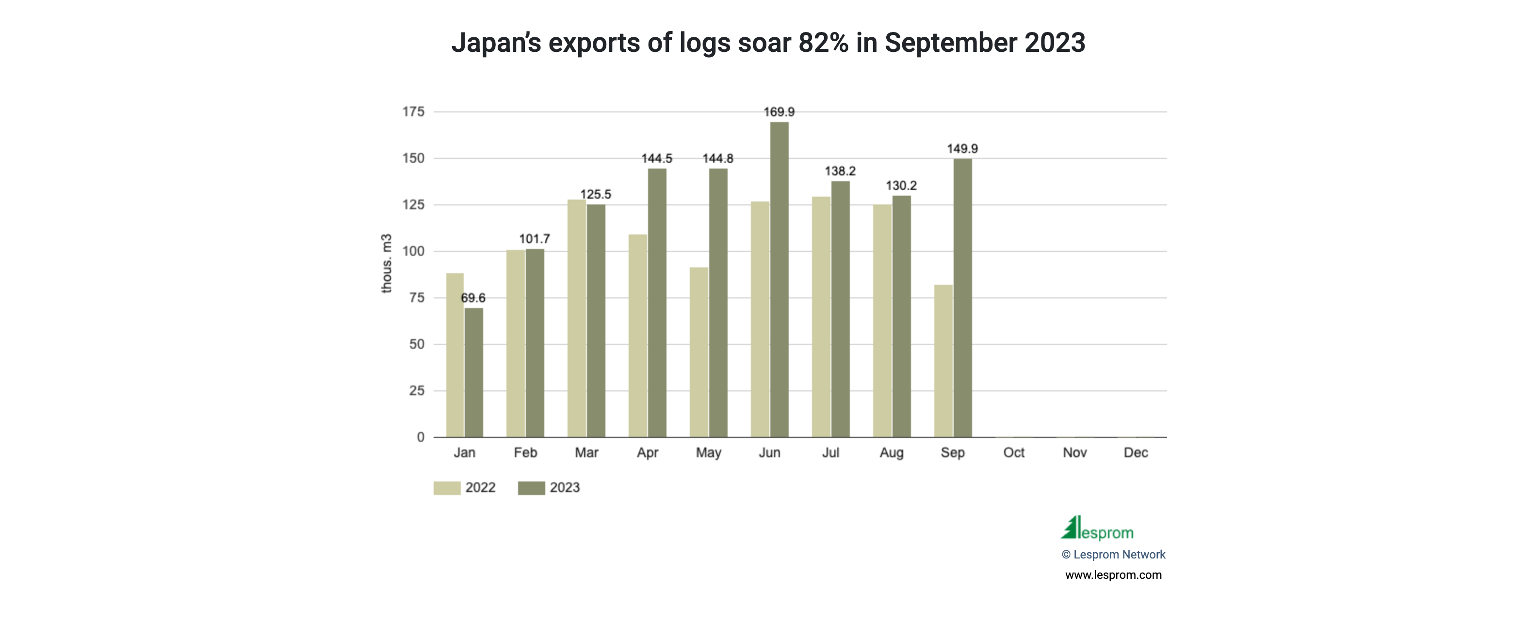 2023년 9월 일본의 원목 수출량은 전년대비 82.3% 증가하여 149.9 thousand m3이었고, 수입액도 57.6% 상승하여 $14.5 million이었습니다. 2023년 9월 일본 원목 수출 평균 가격은 13.5% 하락하여 $97/m3이었습니다.