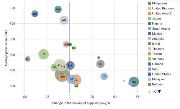 2023년 9월 일본의 wood pellets 수입량은 전년대비 4.4% 증가하여 487.1 thousand ton이었고, 수입액도 7.7% 상승하여 $98.7 million이었습니다. 2023년 9월 일본 wood pellets수입 평균 가격은 3.2% 상승하여 $202.7/ton이었습니다.