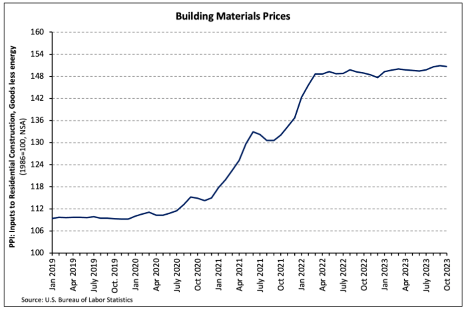 가장 최근의 생산자 가격 지수 (Producer Price Index : PPI)에 따르면 에너지를 제외한 주거용 건설에 투입되는 자재, 즉 건축 자재는 9월 0.2% 상승 이후에 10월에는 0.1% (계절적으로 조정되지 않은) 하락하였습니다. 지수는 전년대비 1.0% 상승하였고, 2019년 1월에서 10월까지 0.1% 하락한 이후에 가장 적은 전년대비 상승을 보여 주었다고 National Association of Home Builders (NAHB)는 발표하였습니다.