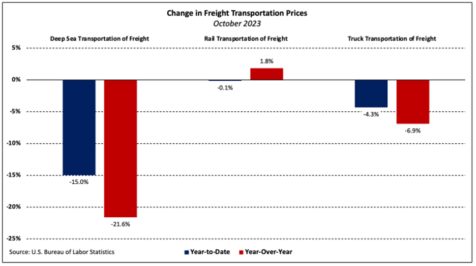 화물 운송 교통의 생산자 가격 변화는 10월에 혼조 된 양상 이었습니다. 철도와 트럭 운송 가격은 각각 1.4%, 1.1% 상승하였습니다. 장거리와 지역 트럭의 PPI는 모두 상승하였습니다. 해양 운송 가격은 10월에 급격하게 11.4% 하락하였습니다. 2023년 8월이후 지수는 17.4% 하락하였지만 역사적 평균보다는 거의 30% 이상 상승하였습니다. 철도, 트럭, 해양 운송 가격의 전년대비는 각각 0.1%, 4.3%, 15.0% 하락하였습니다.