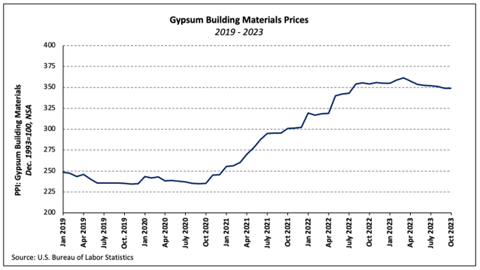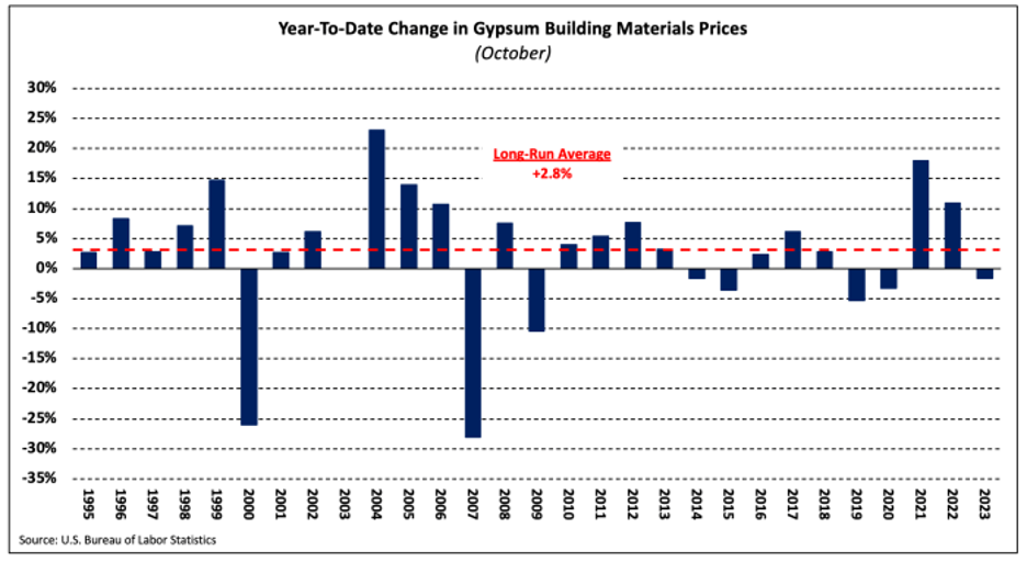 2023년 1월에서 10월까지 석고 건축 자재 지수는 1.6% 하락하였는데, 2022년과 2021년 같은 기간 동안의 지수는 각각 10.9%, 17.9%로 급등하였습니다. 10월의 전년 대비 상승은 1995년 이래 평균적으로 2.8% 이었습니다.