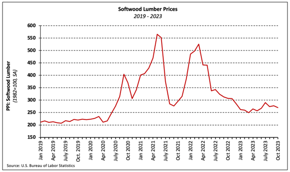 2023년 10월 침엽수 제재목 PPI는 9월에 1.3% 상승한 이후에 2.8% 하락하였습니다. 지수는 지난 한해 동안 12.1% 하락하였고, 2021년 최고 수준보다 52.3% 하락하였습니다.