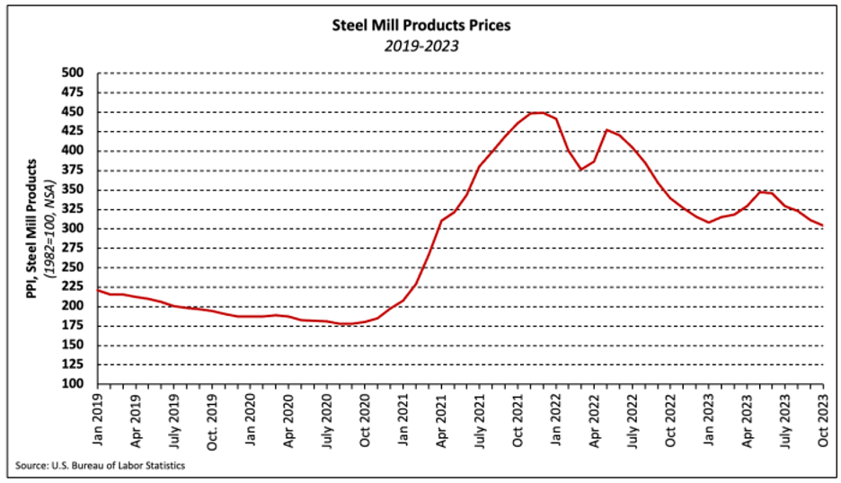 2023년 10월 제철소 생산품 가격은 2.5% 하락하였습니다. 제철소 생산품 가격은 5개월 동안 총 12.5% 하락하여 2021년 3월 이후 가장 낮은 수준 이었습니다. 제철소 생산품 PPI는 2021년의 최고 수준보다 거의 1/3로 하락하였지만 팬더믹 이전 수준보다는 여전히 60% 이상 높게 유지되고 있습니다.