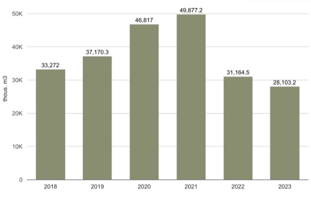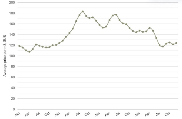 2023년에 중국의 원목 수입은 주목할 만한 하게 9.8% 하락하였습니다. 2023년 중국의 원목 수입량은 28.1 million m3으로 저년 경향과 반대로 하락하였습니다. 2023년 중국의 원목 수입액도 25% 감소하여 $3.76 billion이었습니다. 2023년 중국의 원목 수입 가격은 1월에 $147/m3에서 12월에 $124/m3로 하락하였고, 평균 가격은 전년대비 22% 하락하여 $134/m3이었습니다.