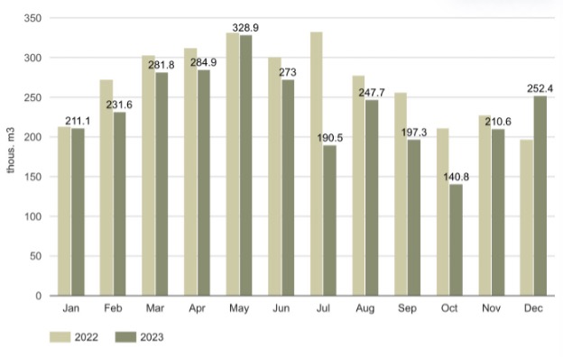 2023년 브라질 제재목 수출량은 전년대비 12% 하락하여 2,851 thousand m3이었고, 수출액도 26% 감소하여 $746 million이었습니다. 2023년 브라질 제재목 수출 평균 가격은 16% 하락하여 $262/m3이었고, 브라질 제재목 수출에 99.5%는 Pine이었습니다.