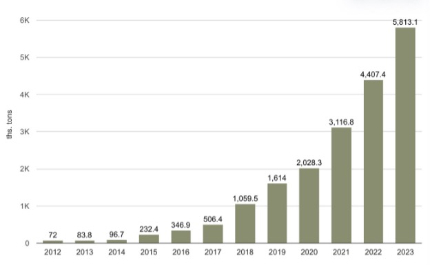 2023년 중국 원목 수입의 두번째 국가는 독일로서 전체의 9%를 차지하였지만, 2022년보다는 지분율이 5% 하락하였습니다. 2023년 중국의 독일 원목 수입량은 전년대비 40% 감소하여 3.3 million m3이었고, 수입액도 44% 전년대비 하락하여 US$576 million이었습니다. 독일 원목 수입 평균 가격은 전년대비 7% 하락하여 US$160/m3 (CIF)이었습니다.