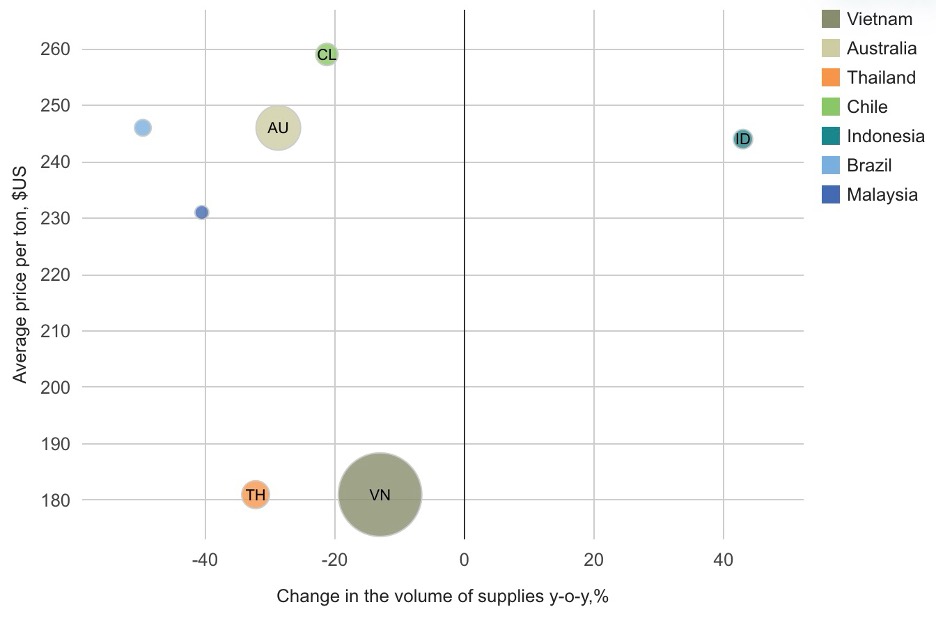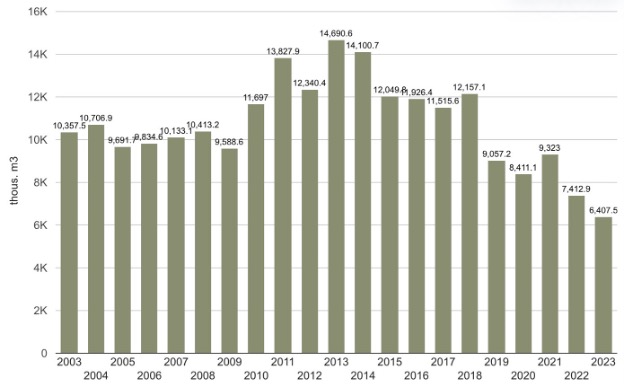 2023년 캐나다 제재목의 수출 역학은 눈에 띄는 전환을 경험하였습니다. 즉 가격과 가치가 조정되면서 수출량이 하락하였습니다. 캐나다 제재목 총수출량은 전년대비 6.0% 하락하여 약 31.99 million m3이었습니다. 수출량이 하락하면서 총수출액도 실질적으로 감소하여 전년대비 40% 하락한 $6.5 billion이었습니다. 2023년 캐나다 제재목 수출 평균 가격은 전년대비 36% 하락하여 $204/m3이었습니다.