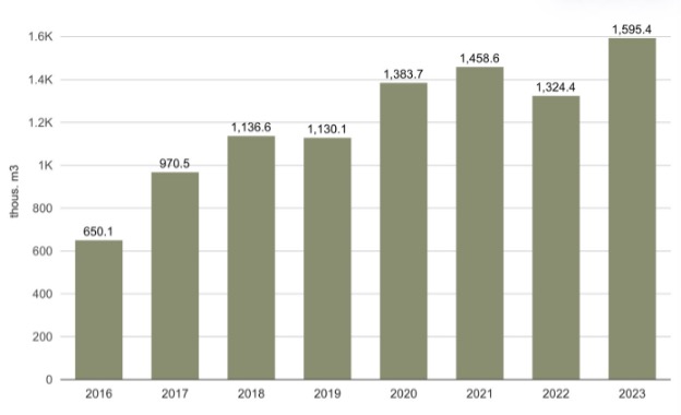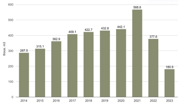 2023년에도 미국은 캐나다 제재목 수입이 지배적으로 유지되어, 캐나다 제재목 총수출의 89%를 차지하였습니다. 하지만 캐나다 제재목의 미국 수출은 전년대비 6.5% 감소하여 28.4 million m3이었고, 이는 주요 시장의 수요 약화를 의미합니다. 이와는 반대로 중국으로의 캐나다 제재목 수출은 반대 경향을 보여주면서 전년대비 19% 상승하여 1.57 million m3이었습니다. 캐나다 제재목의 또 다른 중요 시장인 일본으로의 수출은 전년대비 18% 하락하여 909 thousand m3이었습니다.