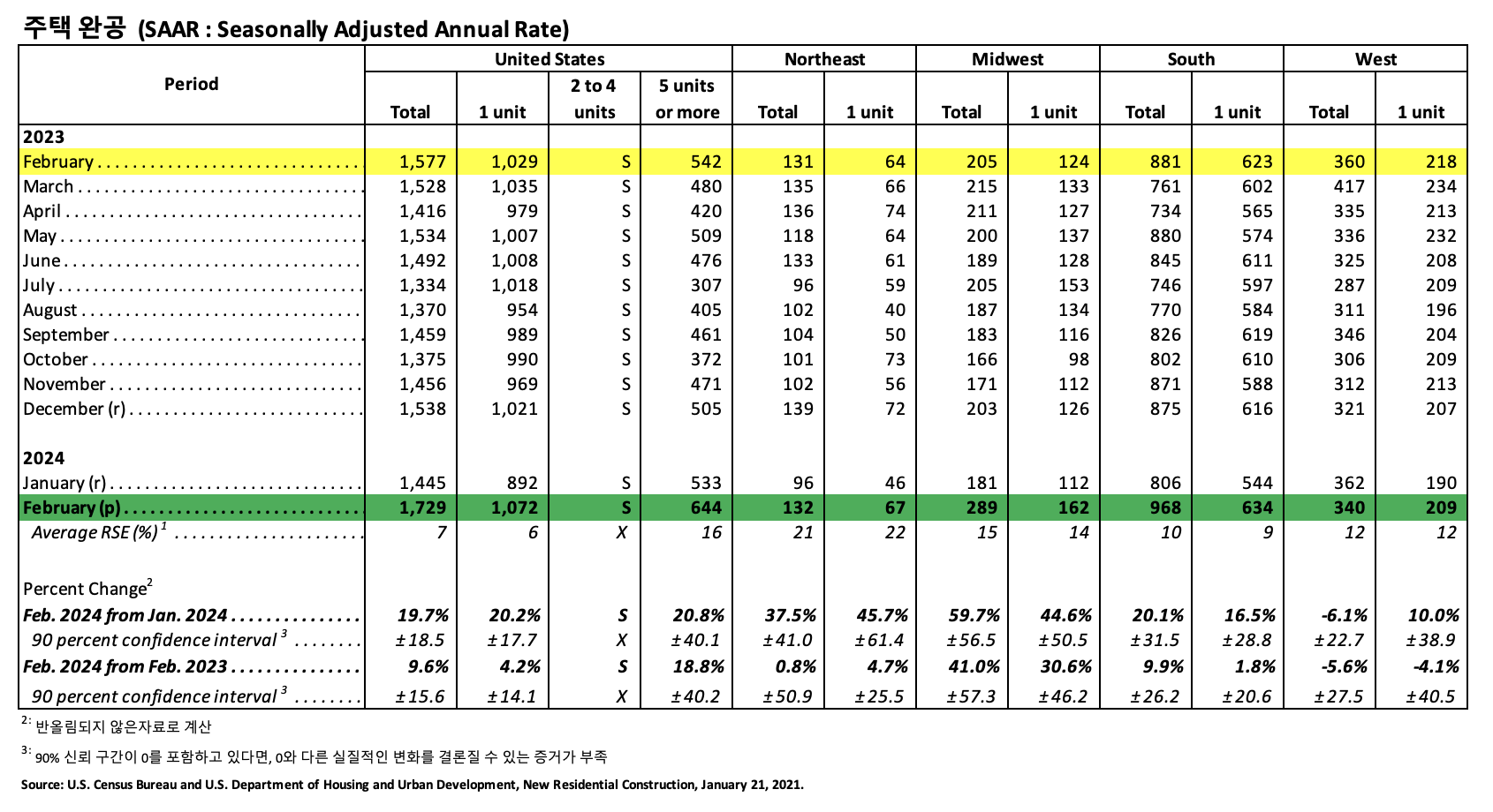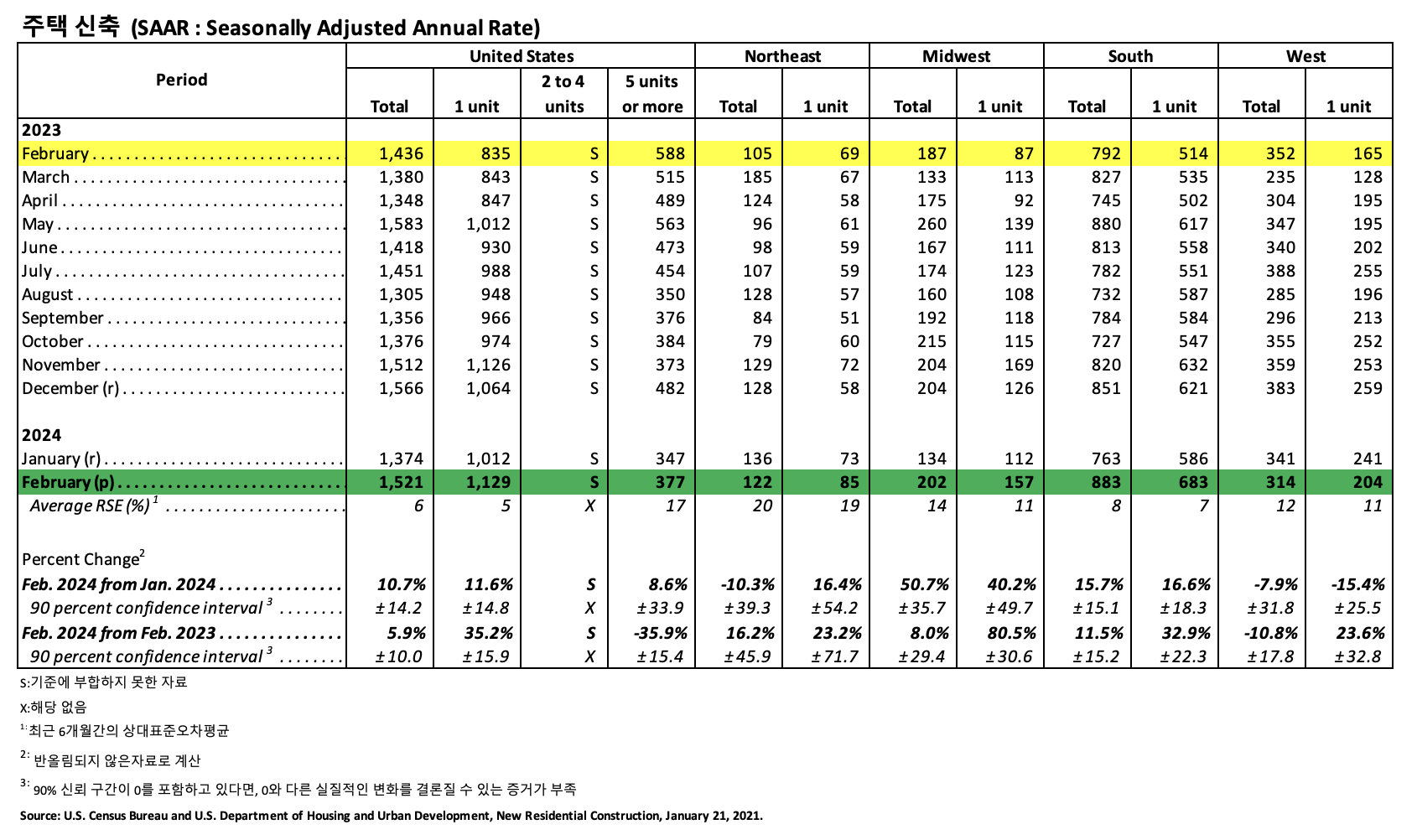 2024년 2월 사유 주택 신축은 1,521,000 (SAAR)으로, 2024년 1월 (1,374,000) 보다 10.7% (±14.2%) 상승하였고, 2023년 2월 (1,436,000) 보다는 5.9% (±10.0%) 높았습니다. 2월의 단독 주택 신축은 1,129,000 (SAAR)으로 2024년 1월 (1,012,000)과 비교하여 11.6% (±14.8%) 상승하였습니다. 5가구 이상의 다중 주택 2월 신축은 377,000 (SAAR) 이었습니다.