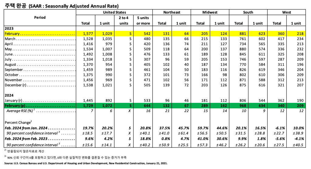 2024년 2월 사유 주택 완공은 1,729,000 (SAAR)으로 2024년 1월 (1,445,000)과 비교하면 19.7%(±18.5%) 상승하였고, 2023년 2월 (1,577,000) 보다 9.6% (±15.6%) 상승하였습니다. 2024년 2월 단독 주택 완공은 1,072,000 (SAAR) 으로 2024년 1월 (892,000)에 비하여 20.2% (±17.7%) 상승하였습니다. 2월의 5가구 이상의 다중 주택 완공은 644,000 (SAAR) 이었습니다.