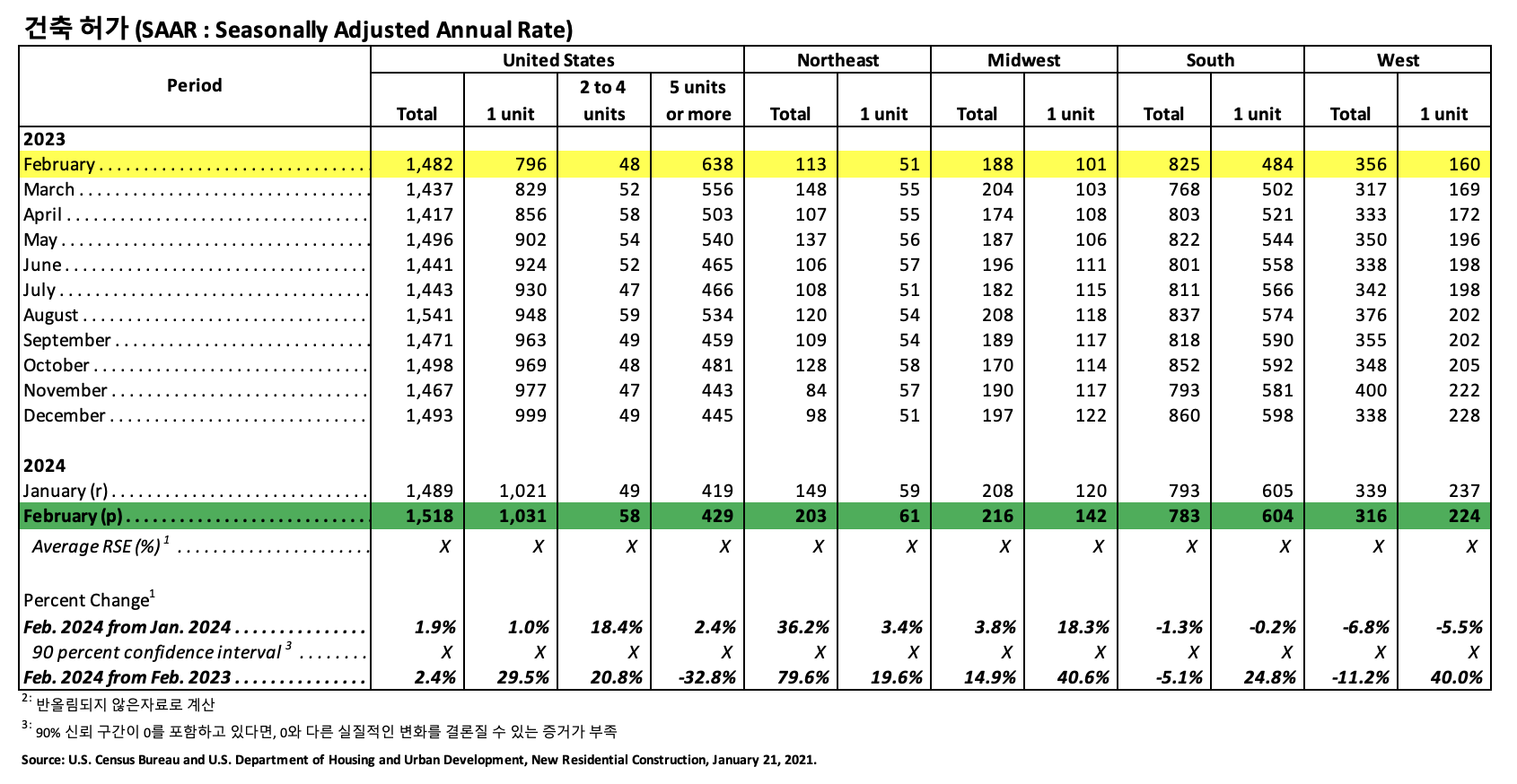 2024년 2월 사유 주택 건축 허가는 1,518,000 (SAAR : Seasonally Adjusted Annual Rate) 으로 2024년 1월 (1,489,000) 보다 1.9% 상승하였고, 2023년 2월 (1,482,000)과 비교하여 2.4% 상승하였습니다. 2024년 2월 단독 주택 건축 허가는 1,031,000 (SAAR)로 2024년 1월 (1,021,000)과 비교하여 1.0% 상승하였습니다. 5가구 이상의 다중 건물의 2월 허가는 429,000 (SAAR) 이었습니다.