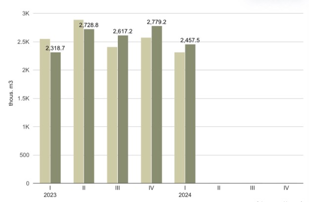 2024년 1사분기 러시아 합판의 생산량은 2023년 1사분기(739 thousand m3)와 비교하여 17% 증가하여 868 thousand m3이었다고 Rosstat는 발표하였습니다. 이런 증가에도 불구하고 2022년 1사분기 생산량인 1,035 thousand m3에 비하면 여전히 16% 낮은 수분입니다.