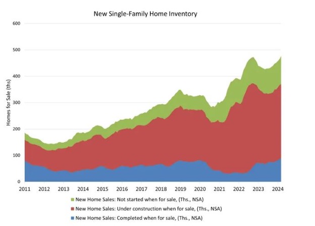 • 동북부 : +15.1% • 중서부 : +17.8% • 서부 : +28.1% • 남부 : -6.6% 2024년 3월 새 단독주택 재고는 2월보다 2.6% 증가하여 477,000이었습니다, 이는 현재 건설 속도 기준으로 8.3개월 공급이 가능합니다. National Association of Realtors의 데이터에 따르면 3월의 기존 단독 주택 재고는 3.1개월 공급이 가능한데, 균형된 시장은 일반적으로 5-6개월 공급 물량입니다. 새로 건설된 단독 주택 재고는 전년대비 10.2% 증가하였습니다.