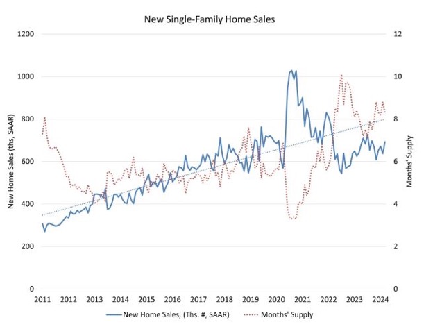 2024년 3월 새로 건설된 단독 주택은 8.8% 증가하여 계절적으로 조정된 연이율 (SAAR)로 693,000이었는데, 이는 2월보다 하락하였습니다. 3월의 새집 판매 속도는 2024년 초반보다 8.3% 상승하였습니다.
