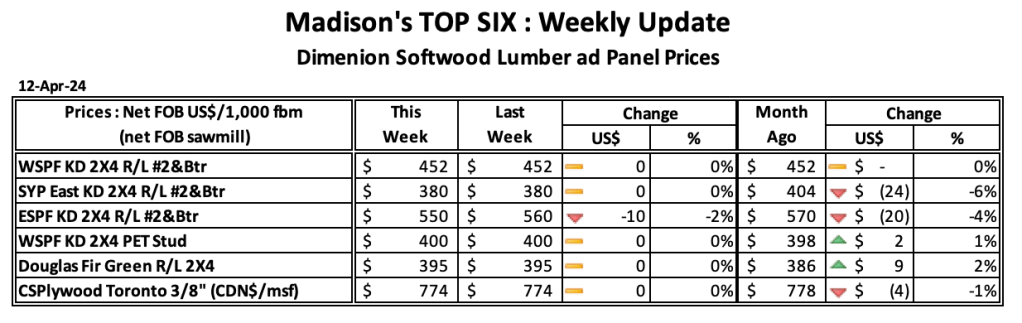 2024년 4월 12일로 마감한 주의 Southern Yellow Pine East Side 2×4 #2&Btr KD (RL)의 가격은 US$380 mfbm로 전주 가격인 US$380에 비하여 변화가 없었고, 전월 가격인 US$404 mfbm보다 $24, 6% 하락하였습니다. 1년전 같은 시기의 가격인 US$545 mfbm와 비교하여 $165, 30% 하락하였고, 2년전 같은 시기의 가격인 $835에 비하여 $455, 54 낮았습니다.