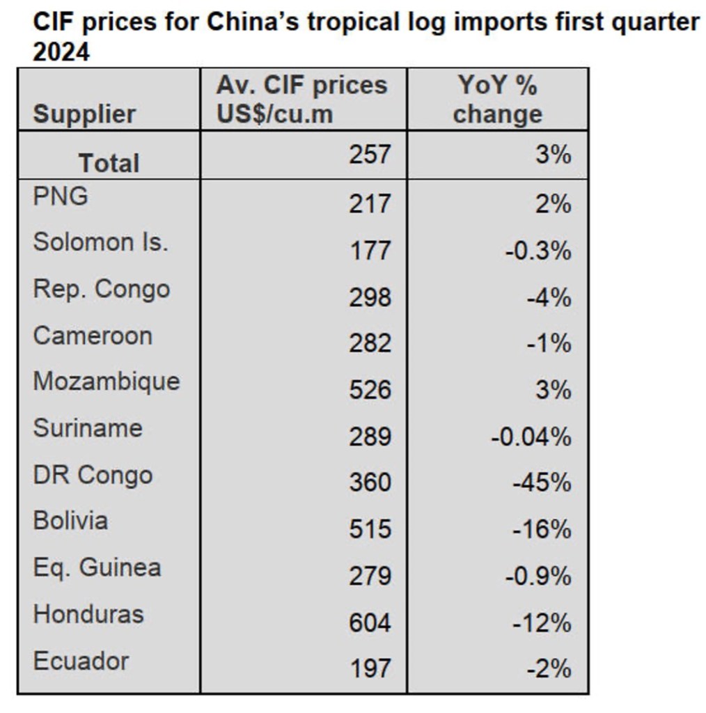 2024년 1사분기에 열대재 원목 중국 수입 평균 가격은 3% 상승하여 US$257/m3 이었고, 파푸아 뉴기니와 모잠비크의 열대재 원목 수입 평균 가격이 각각 2%, 3% 상승하였습니다. 이와는 반대로 다른 국가의 열대재 원목 중국 수입 가격은 하락하였습니다. 콩고 민주 공화국의 열대재 원목 중국 수입 가격(CIF)이 45% 하락하였고, 볼리비아와 온두라스 열대재 원목 중국 수입 가격이(CIF)은 각각 16%, 12% 하락하였다는 것이 주목할만 하였습니다.