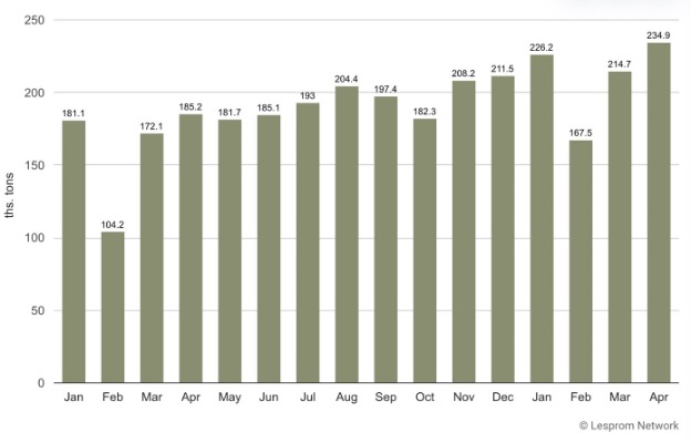 2024년 4월 중국의 fiberboard 수출은 전년대비 27% 증가하여 235 thousand tons 이었고, 수출액도 12% 성장하여 $122 million이었습니다. 하지만 중국의 fiberboard 수출 평균 가격은 11% 하락하여 $518/ton이었습니다.