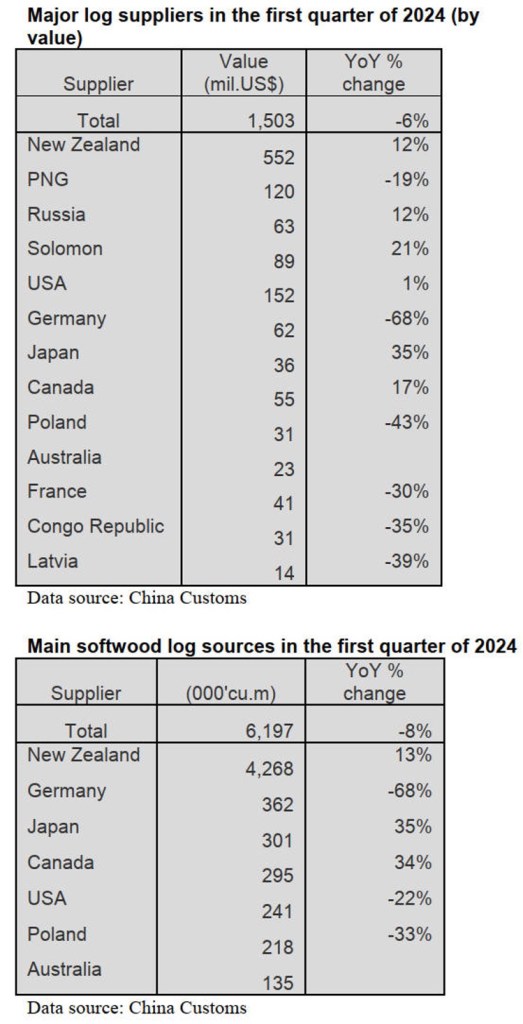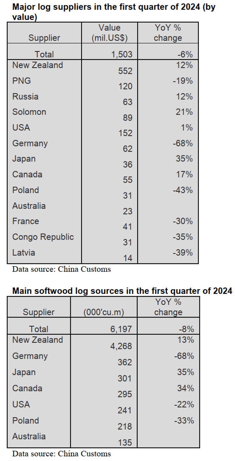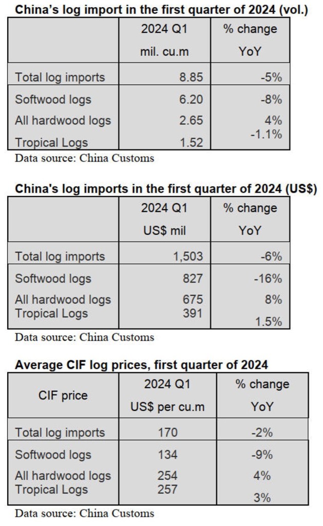 중국 관세청(China Customs)에 따르면 중국의 원목 수입량은 하락하여, 2024년 1사분기 원목 수입량은 2023년 1사분기와 비교하여 5% 감소하여 8.85 million m3이었고, 수입액도 6% 하락하여 US$1.503 billion이었습니다. 더군다나 2024년 1사분기 중국의 원목 수입 평균 가격도 2% 하락하여 US$170/m3 (CIF)이었습니다. 1사분기동안 전체 원목 수입량에서, 침엽수 원목 수입량은 8% 감소하여 6.20 million m3이었고, 전체의 70%를 차지하였습니다. 침엽수 원목 수입 평균 가격은 전년대비 9% 하락하여 US$134/m3 (CIF) 이었습니다.