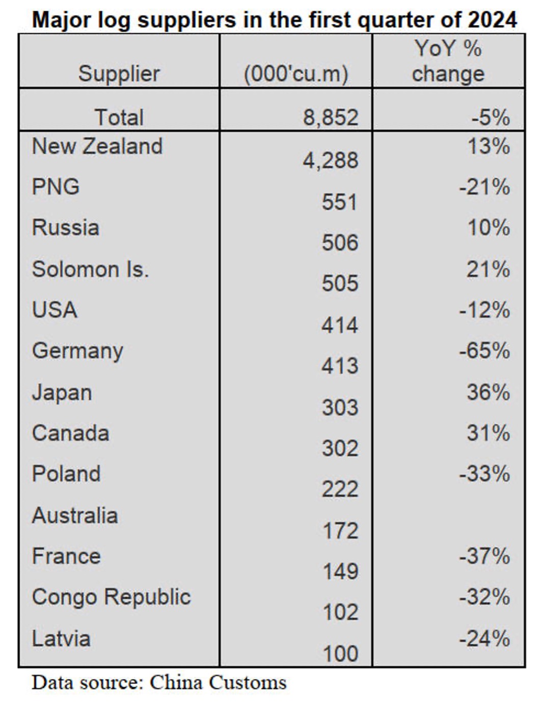 독일 원목의 중국 수입은 급격하게 하락하여 2024년 1사분기 수입량은 전년대비 65% 감소하여 Sharp 413,000 m3이었고, 수입액도 68% 하락하여 US$62 million이었습니다. 독일 원목의 중국 수입 평균 가격도 10% 하락하여 US$150/m3이었습니다. 이런 급격한 하락의 원인은 러시아-우크라이나 갈등으로 인하여 유럽에서 에너지 가격이 일반적으로 상승하였고, 독일에서의 제조와 산업 생산 비용이 심각하게 증가하였습니다. 그러면서 독일 원목은 중국에서 제2위 수입국가에서 2024년 1사분기에 6위로 떨어졌습니다. 뉴질랜드 원목의 중국 수입은 여전히 가장 많아서, 2024년 1사분기 뉴질랜드 중국 수입량은 전년대비 13% 상승하여 4.29 million m3이었고, 수입액도 12% 증가하여 US$552 million이었습니다. 하지만 뉴질랜드 원목의 중국 수입 평균 가격은 2% 하락하여 US$129/m3이었습니다. 뉴질랜드 원목의 수입량은 중국의 전체 원목 수입량에서 48%를 차지하였습니다.