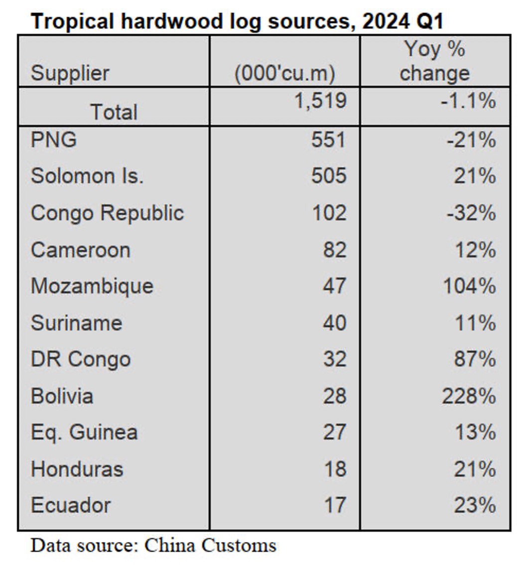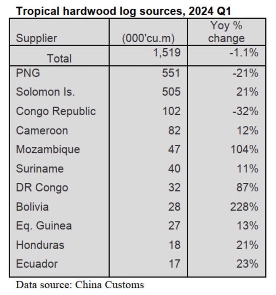 열대재 원목의 중국 수입량은 2024년 1사분기에 전년대비 1% 감소하여 1.519 million m3이었습니다. 2024년 1사분기에 열대재 원목 중국 수입의 상위 3개국은 파푸아 뉴기니이(36%), 솔로몬 제도(33%), 콩고 공화국(7%) 으로, 이들 3개국에서의 수입량은 중국 열대재 원목 전체 수입량의 76%를 차지하였습니다. 2024년 1사분기에 솔로몬 제도 원목의 중국 수입량은 전년대비 21% 증가하였지만, 파푸아 뉴기니와 콩고 공화국에서의 수입량은 각각 21%, 32% 하락하였습니다. 모잠비크와 볼리비아 원목의 중국 수입이 2024년 1사분기에 급격하게 증가한 것이 주목할만 하였습니다. 하락의 시기 이후에 중국 시장에서 다시 한번 아프리카 원목이 강한 관심을 받고 있습니다. 아프리카 국가들에서 중국의 원목 수입량은 2024년 1사분기에 전년대비 3% 증가하여 387,000 m3이었습니다.