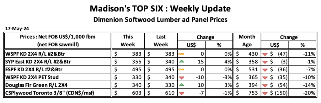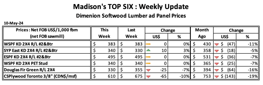 2024년 5월 10일로 마감한 주의 Southern Yellow Pine East Side 2×4 #2&Btr KD (RL)의 가격은 US$340 mfbm으로 전주 가격인 $330에 비하여 $10, 3% 상승하였지만, 전월 가격인 US$358 mfbm와 비교하여 $18, 5% 하락하였습니다. 1년전 같은 시기의 가격인 US$510 mfbm에 비하여 $170, 33% 하락하였고, 2년전 같은 시기의 가격인 $825에 비하여 $485, 59% 낮았습니다.